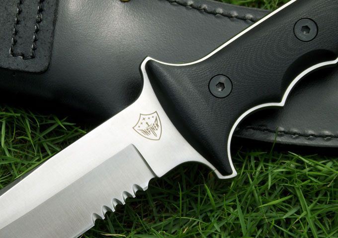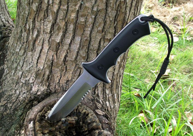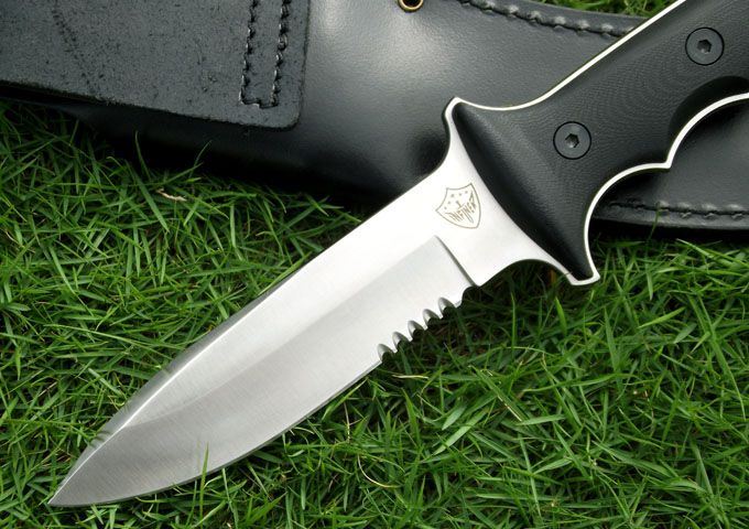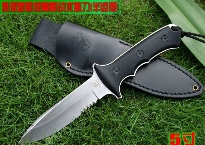 鹰版新款绿扁帽战术直刀(5寸半齿版) 全长:278(5寸) 刃长:140(5寸) 柄长:138 刃厚:5.6 刃材:A2 硬度:59-60HRC 表面:钢本色 柄材:G10 刀鞘:牛皮 磨法:凹磨
