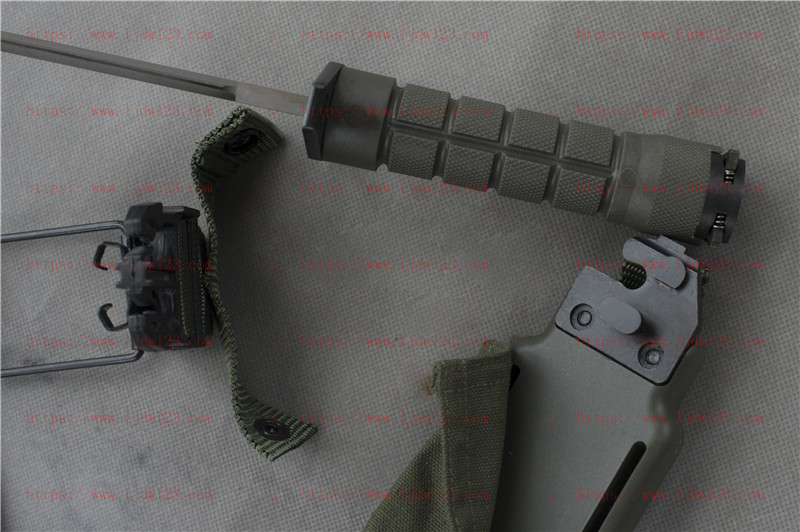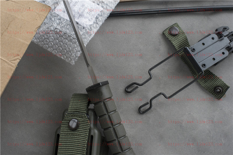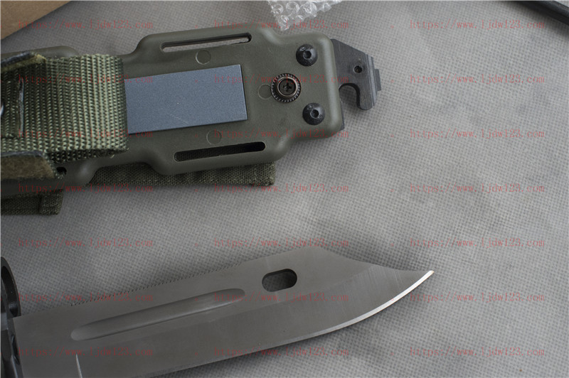 刀鞘:ST801尼龙 ,内置Stainless Steel刀身,固定安全装置,背面隐藏镀铝陶瓷磨刀棒,MOLLE多功能挂具,排水功能孔,低噪音设计