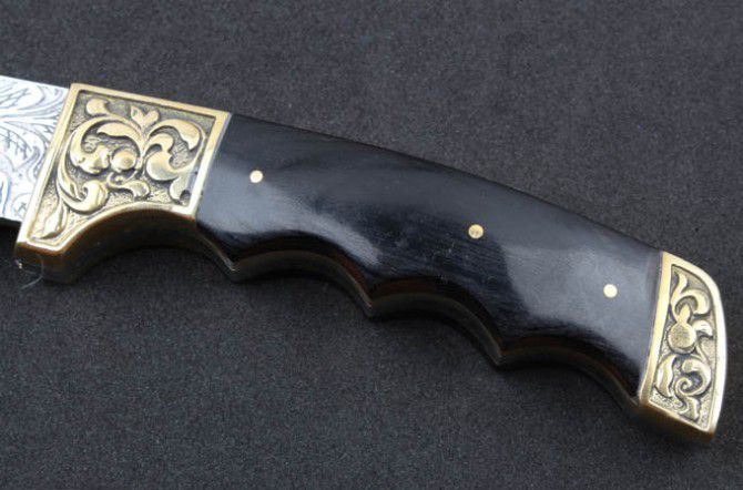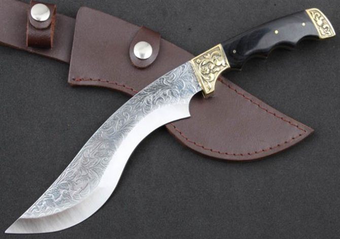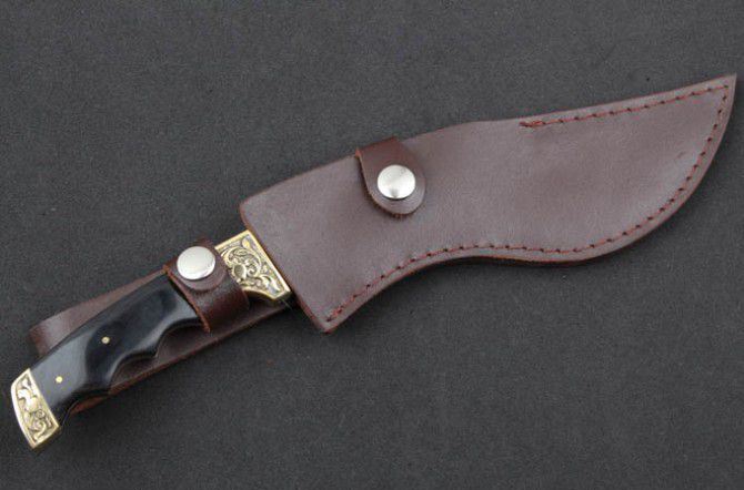 小月牙狗腿(黑檀木柄) 全 长:295mm 刃 长:188mm 柄 长:113mm 刃 宽:40mm 刃 厚:4.0mm 刃 材:5Cr13Mov 重 量:399g(含包装) 硬 度:57HRC 表 面:腐蚀纹 柄 材:双铜头+黑檀木柄 锁 型:定锁 其 他:配牛皮套