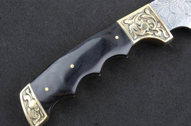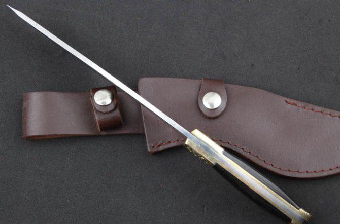 全 长:295mm 刃 长:188mm 柄 长:113mm 刃 宽:40mm 刃 厚:4.0mm 刃 材:5Cr13Mov 重 量:399g(含包装) 硬 度:57HRC 表 面:腐蚀纹 柄 材:双铜头+黑檀木柄 锁 型:定锁 其 他:配牛皮套