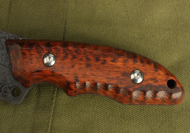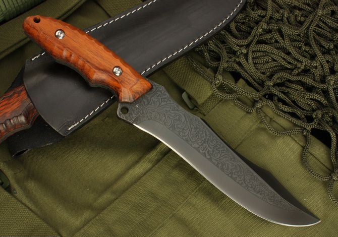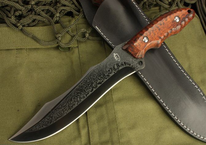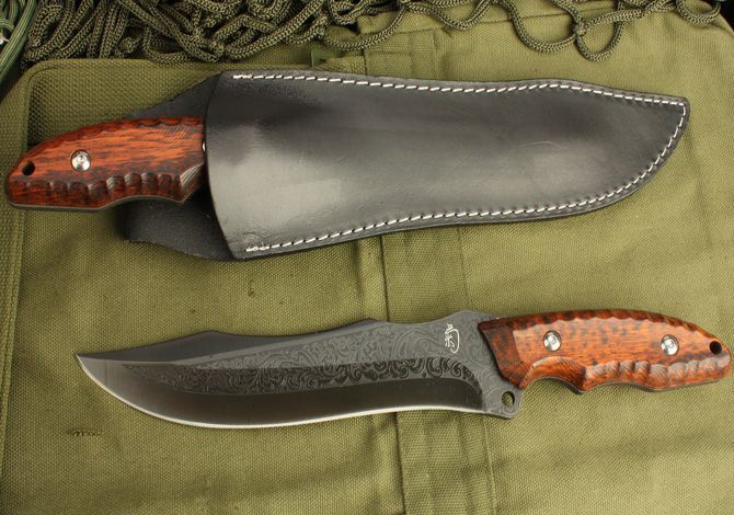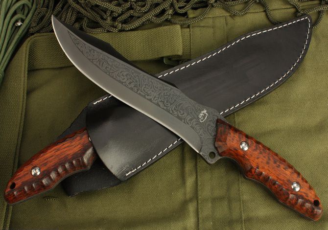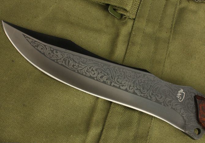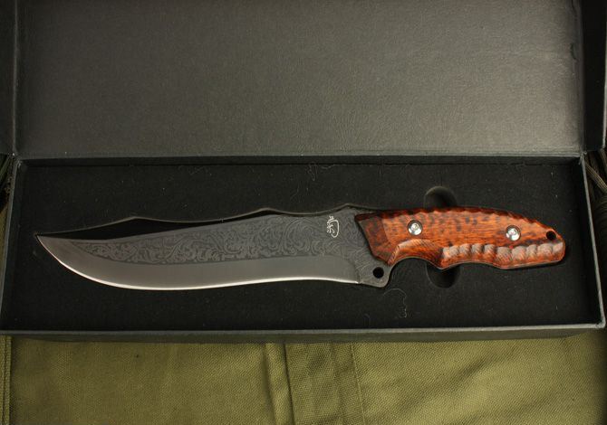 全长:31.3cm 刃长:20cm 刃宽:3.6cm 刃厚:6.5cm 刃材:440 高级不锈钢 硬度:57HRC 表面:钛金处理,电脑雕刻 柄材:泰国蛇木 柄长:11.5cm 鞘材:皮套 刀重:425克 总重:720克(配纸合) 品质:高品质