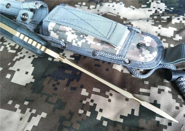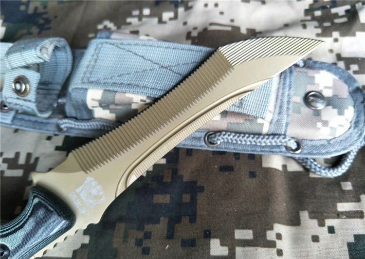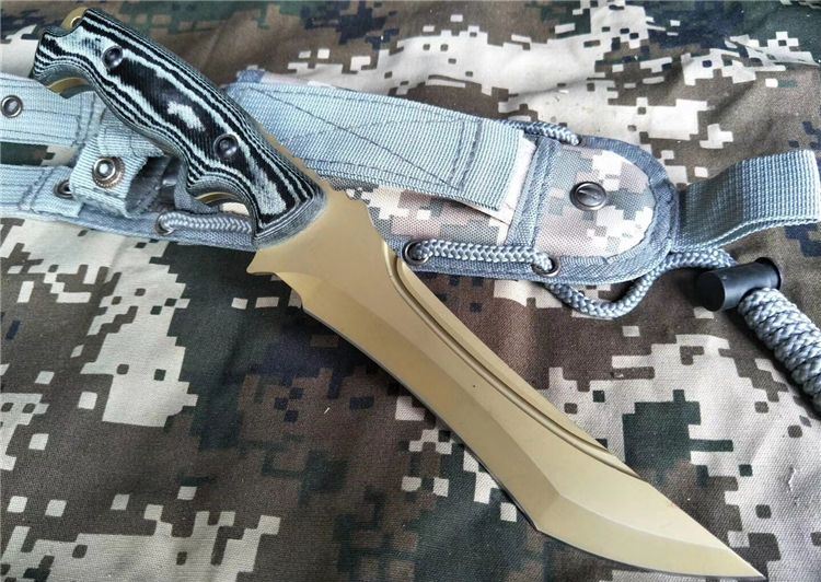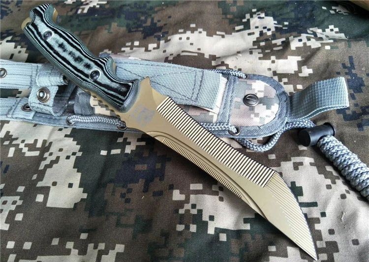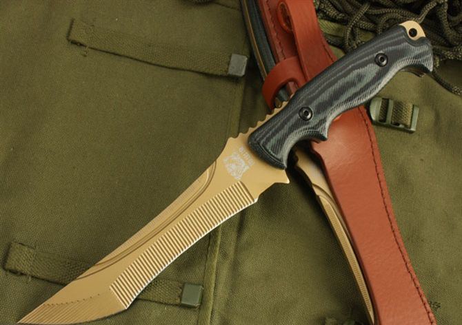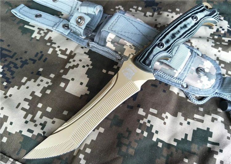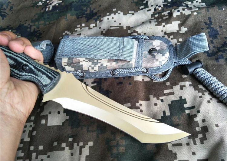 全 长: 30.5cm 刃 长: 16.8cm 刃 宽: 3cm(最宽处) 柄 长: 13.5cm 刃 材: 7Cr17MoV 硬 度: 59 HRC 表 面: 机械浮雕,镀金 刃 厚: 0.58cm 柄 材: 龙骨结构,高档米克塔枝木柄片 净 重: 415g 总 重: 720g(包括纸盒和刀鞘) 包 装:原装纸盒 其 他:配附尼龙刀鞘
