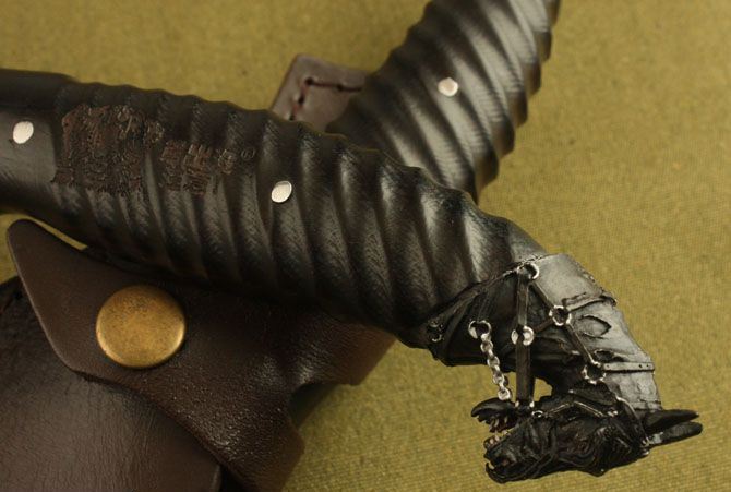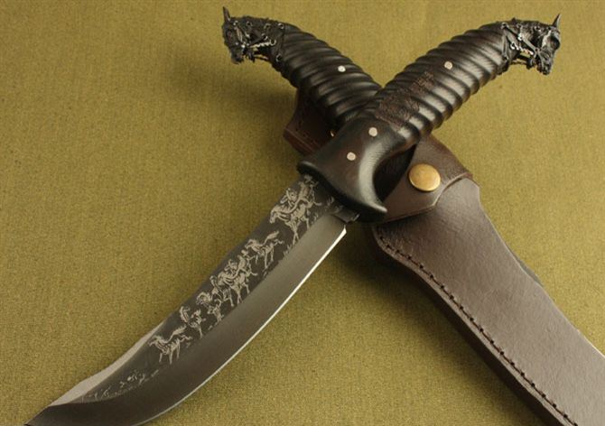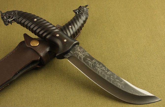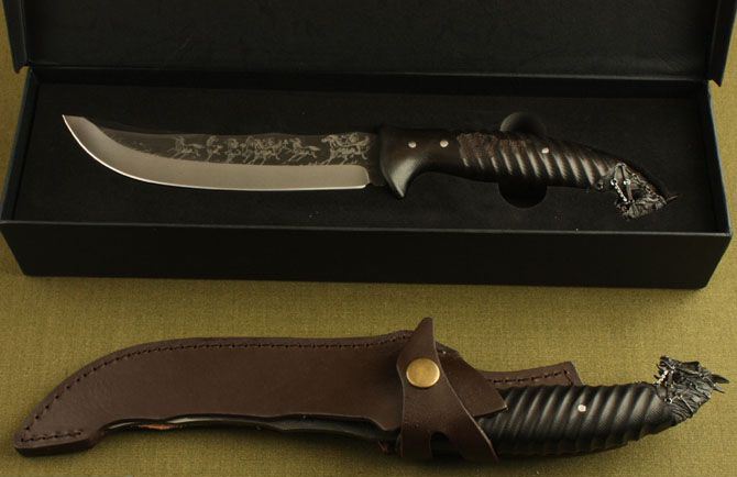 熊出没—黑马直刀 全 长: 31cm 刃 长: 16cm 刃 宽: 3cm(最宽处) 柄 长: 14cm 刃 材: 7Cr17MoV 硬 度: 58 HRC 表 面: 机械浮雕 刃 厚: 0.36cm 柄 材: 黑檀木 净 重: 470g 总 重: 600g(包括纸盒和刀鞘) 包 装:原装纸盒 其 他:配附真皮刀鞘 品 质: 品质卓越