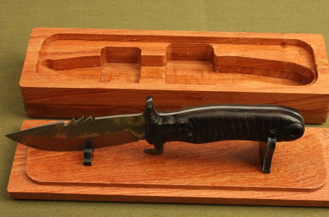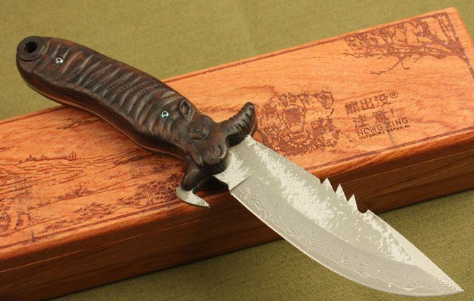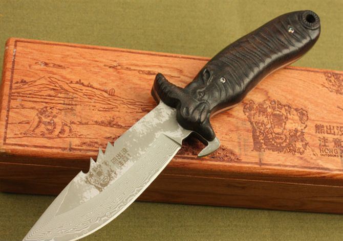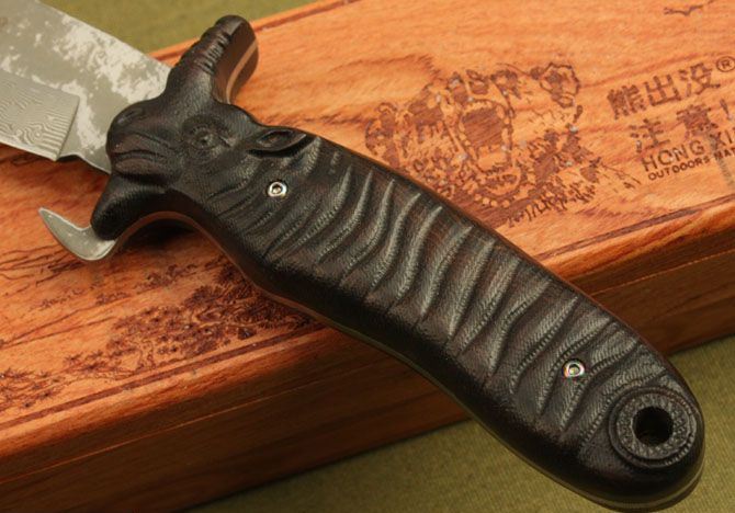 熊出没-犀牛大马士革收藏版 全 长: 22.8cm 刃 长: 11cm 刃 宽: 3cm(最宽处) 柄 长: 11.8cm 刃 材: 大马士革 硬 度: 59 HRC 表 面: 电脑浮雕精美图案 刃 厚: 0.25cm 柄 材: 高档黑檀木 净 重: 180g 总 重: 790g 包 装:木盒 品 质: 品质卓越