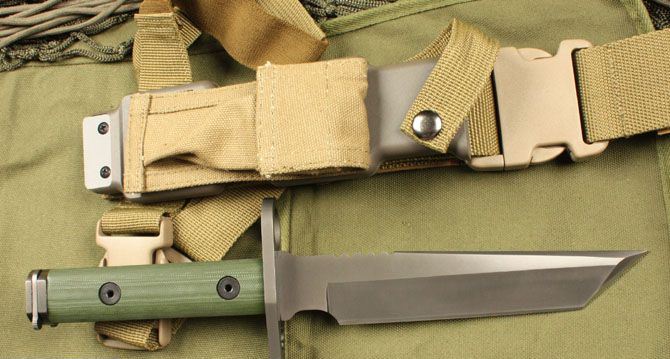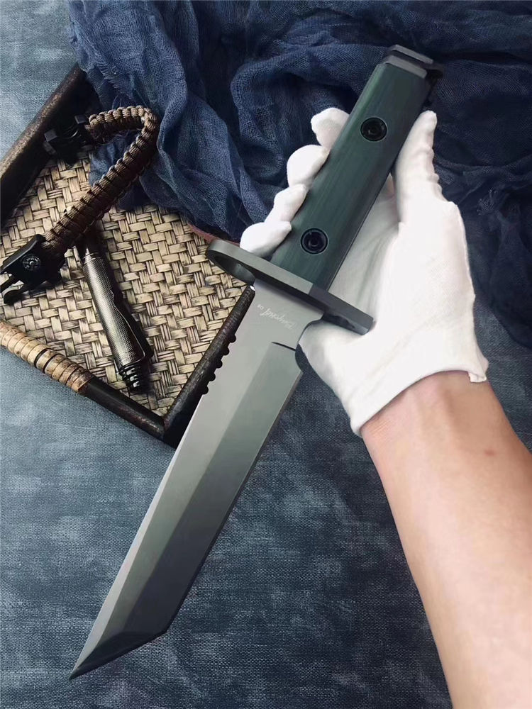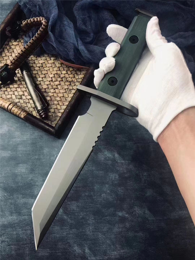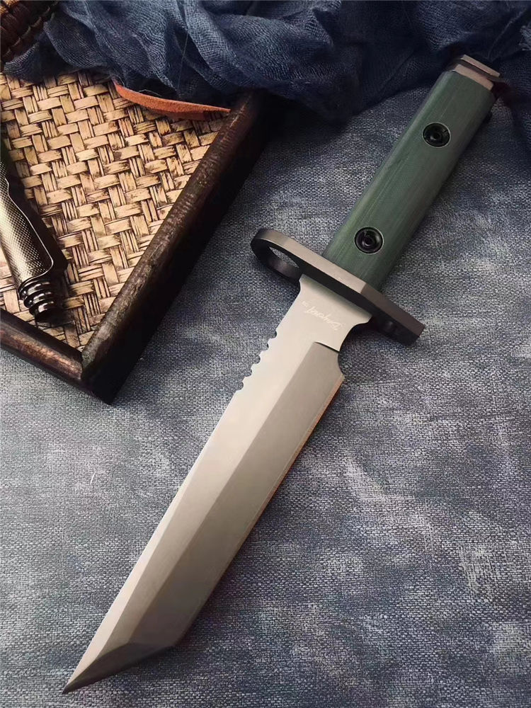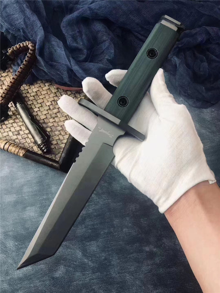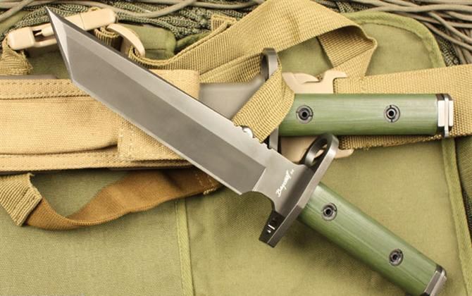 全 长: 32cm 刃 长: 19cm 刃 宽: 3.7cm(最宽处) 柄 长: 12.5cm 刃 材: D2钢 硬 度: 58-59HRC 表 面: 钛离子 刃 厚: 0.60cm 柄 材: 龙骨结构,绿色G10柄片 净 重: 540g 总 重: 1040g(包括纸盒和刀鞘) 包 装:原装纸盒 其 他:配附ABS刀鞘 品 质: 品质卓越