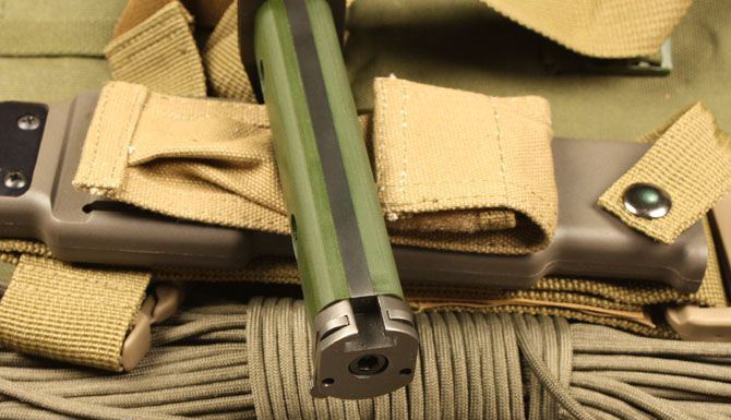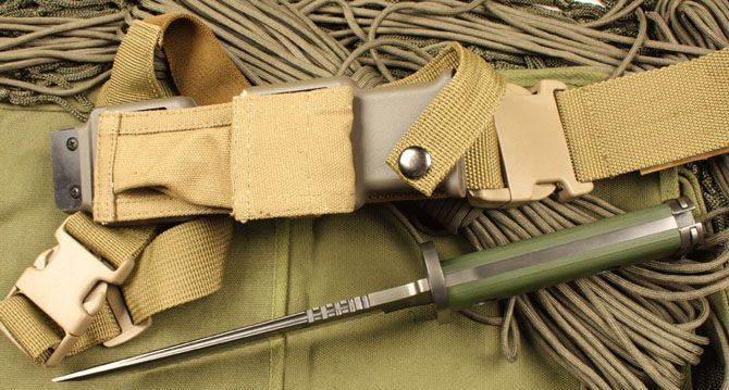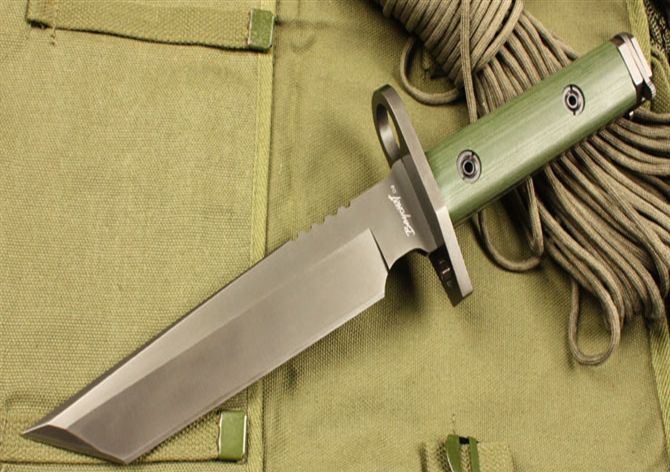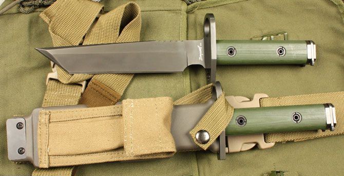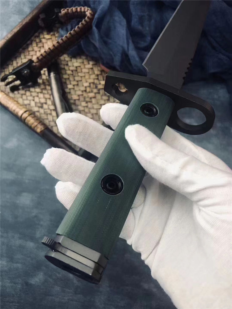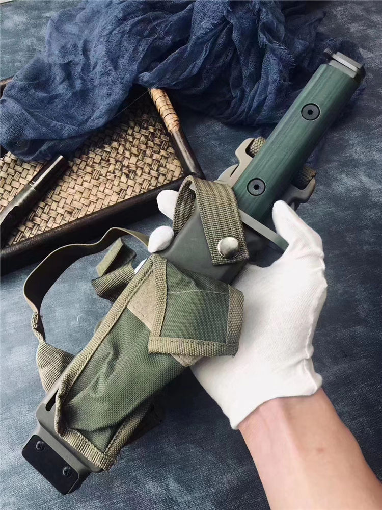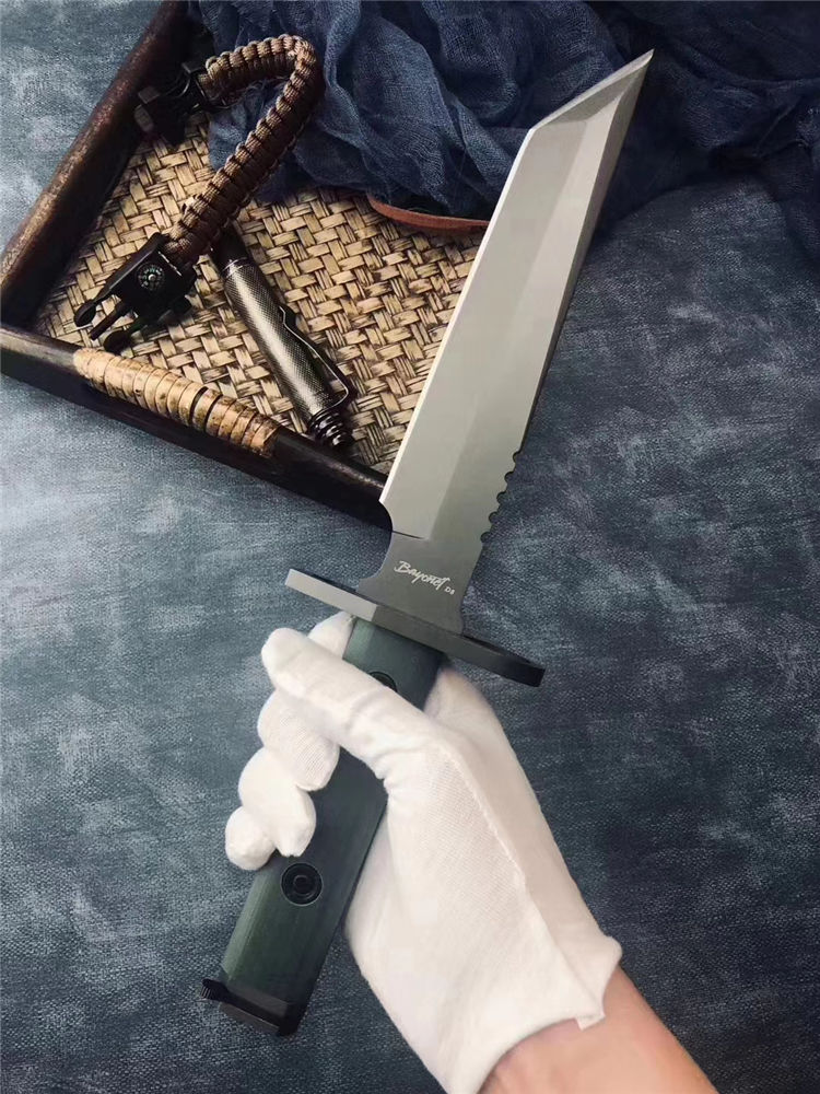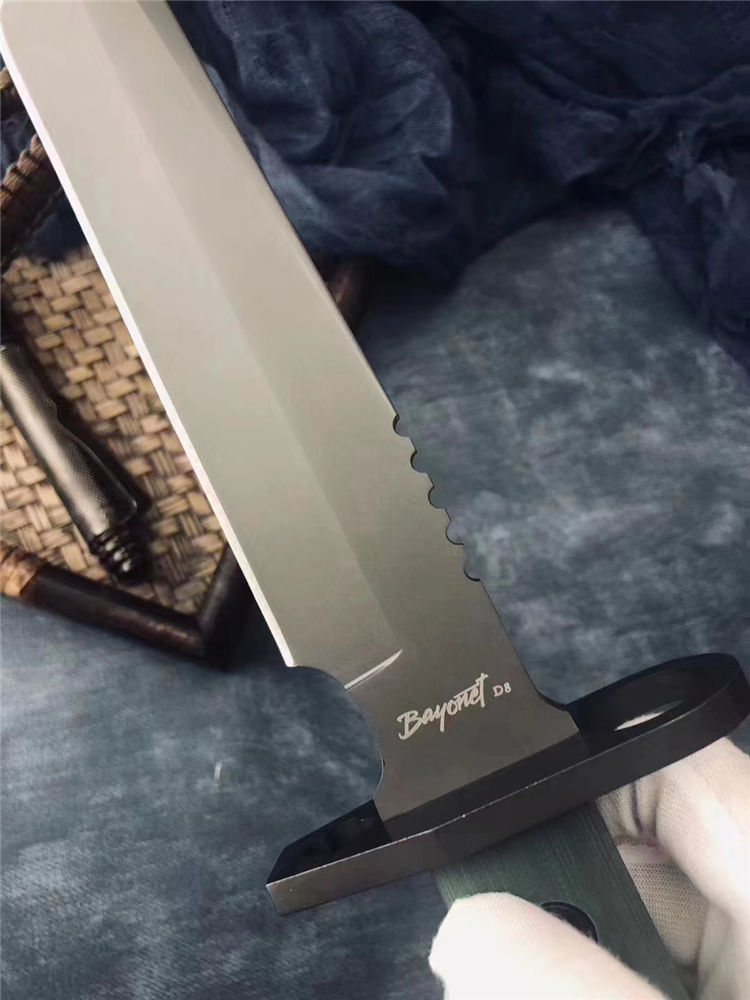 Bayonet D8枪刺 全 长: 32cm 刃 长: 19cm 刃 宽: 3.7cm(最宽处) 柄 长: 12.5cm 刃 材: D2钢 硬 度: 58-59HRC 表 面: 钛离子 刃 厚: 0.60cm 柄 材: 龙骨结构,绿色G10柄片 净 重: 540g 总 重: 1040g(包括纸盒和刀鞘) 包 装:原装纸盒 其 他:配附ABS刀鞘 品 质: 品质卓越