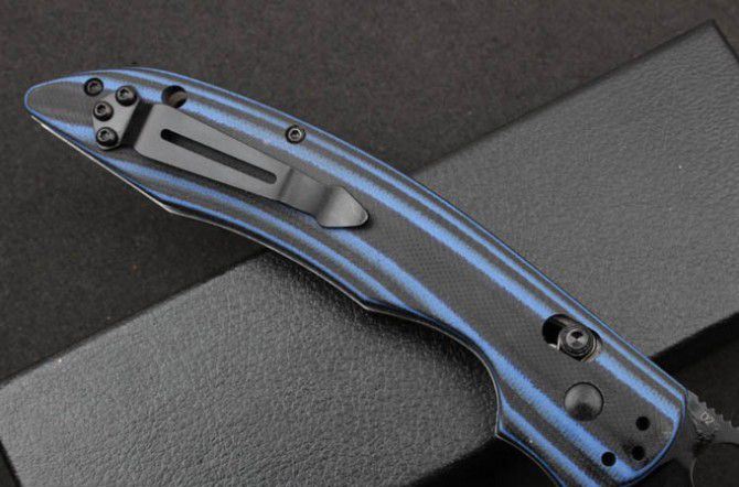 全长:23.9CM 刃长:10CM 刃厚:0.37CM 刃宽:2.8CM 刃材:GB-D2 硬度:60-62 HRC 柄材:黑蓝柄G10 原产地:美国