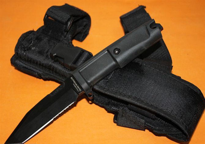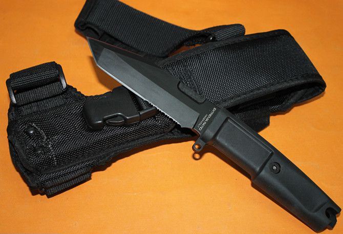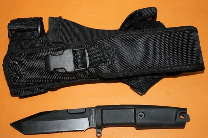 意大利极武K9防卫刀 全 长: 25.5cm 刃 长: 12cm 刃 宽: 3.3cm(最宽处) 柄 长: 13cm 刃 材: 440 硬 度: 57 表 面: 黑钛 刃 厚: 0.58cm 柄 材: 橡塑 刀 鞘:CORDURA(科杜拉),内置快拨塑料鞘 重 量:刀:276g 鞘:230g 包 装:仿原厂纸盒包装,带英文说明书 其 他:几何T头,半齿刃口,贯通一体结构,短小精悍