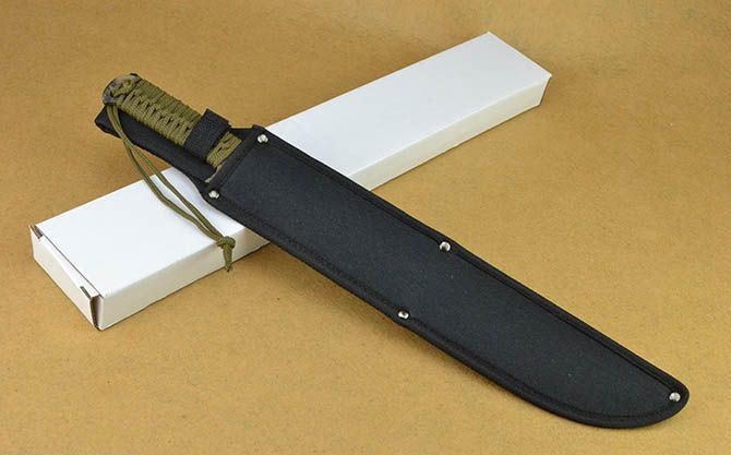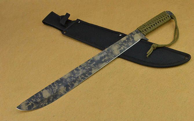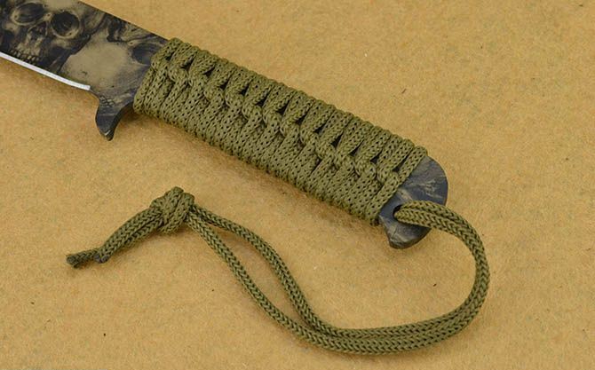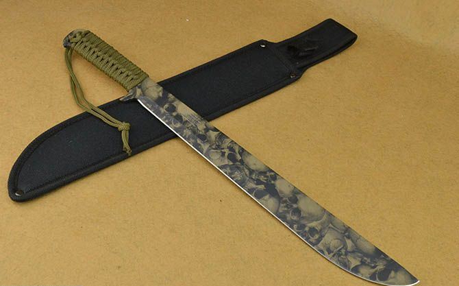 全 长:45cm 刃 长:33.5cm 刃 宽:3.9cm(最宽处) 刃 厚:4.1mm 柄 长:10.5cm 表 面: 披覆,骷髅头图案 刃 材: 420 硬 度: 56HRC 柄 材: 一体全柄+绑绳 重 量:550克(含包装) 包 装:尼龙套、纸盒。