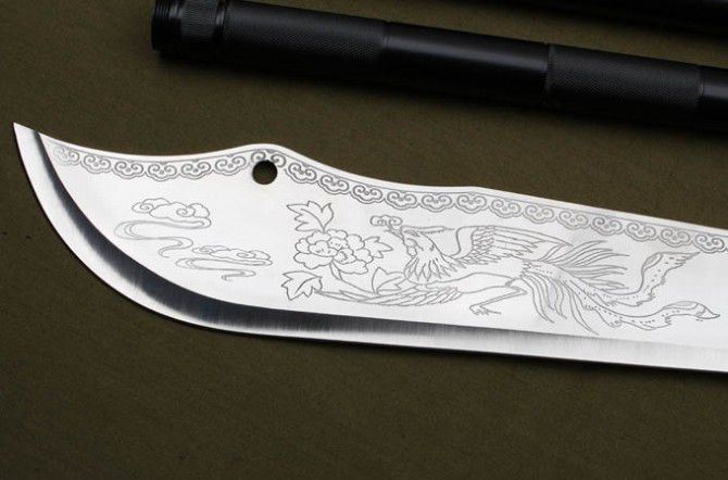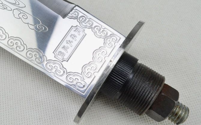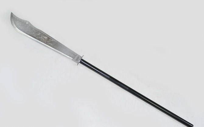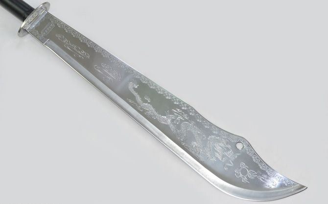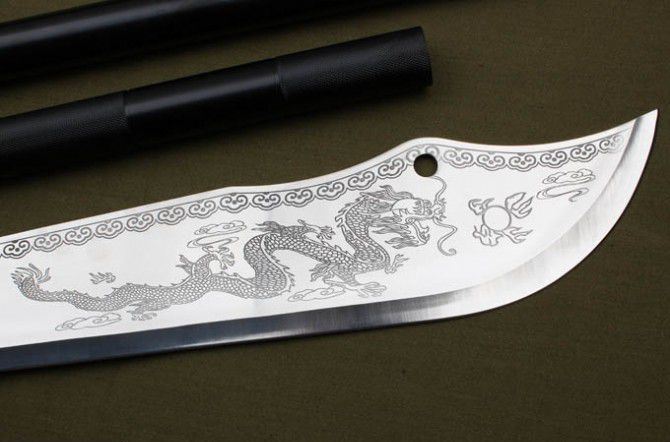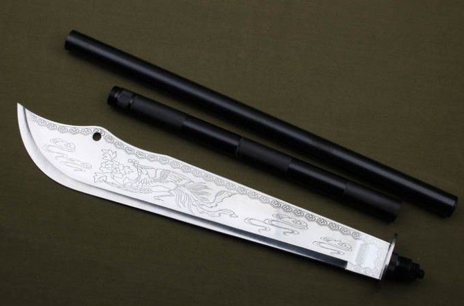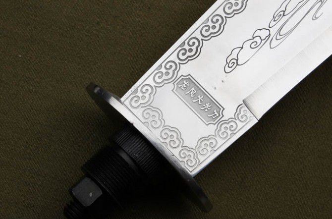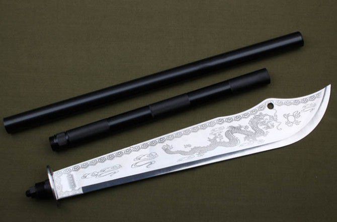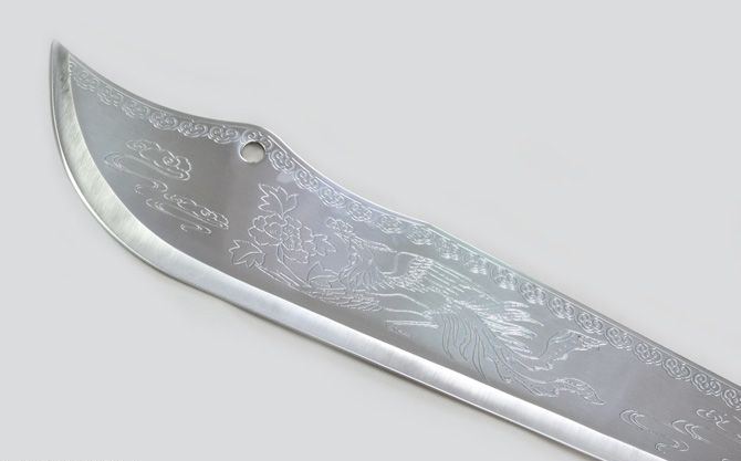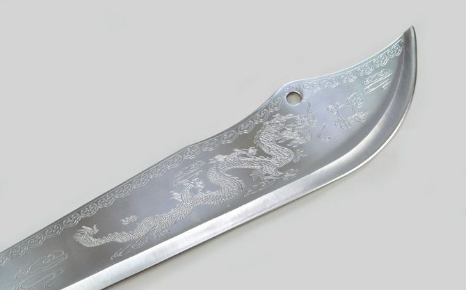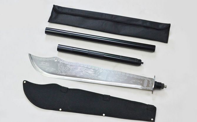 龙凤吉祥三节大关刀 全 长:1590mm 刃 长:510mm 刃 宽:100mm(最宽) 刃 厚:3.5mm 刃 材:3Cr13Wov 硬 度:55HRC 柄 材:全钢氧化黑 净 重: 3200克 刀 鞘:黑色尼龙套 表 面:钢本色(电脑雕刻)