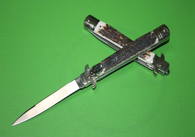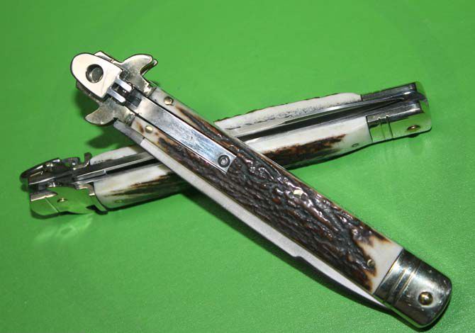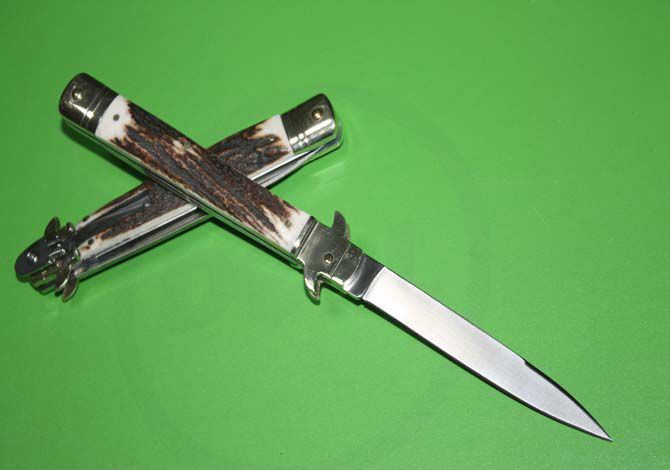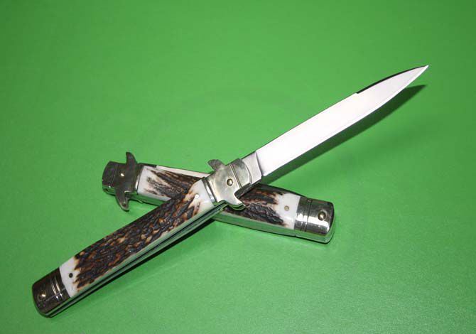 外贸尾货9.5“鹿角柄意大利AKC古典跳刀 全 长 :24.5cm 柄 长 : 13.5cm 刃 长 : 10 cm 刃 厚 : 2.8mm 刃 材 : 高速D2钢 硬 度 : 58-60HRC 柄 材 : 双黄铜护手+鹿角 重 量 :140克 意大利AKC著名手工刀匠Bill Deshilvs设计,经典的杠杆纽扣锁定,弹簧快速打开刀刃,高速D2钢刀刃,搭配鹿角和铜护手,非常经典极具收藏价值,因为是出口尾货不打任何字唛,希望各位刀友们珍惜机会抢购,售完直至!9.5英寸,刀锋极其锋利!