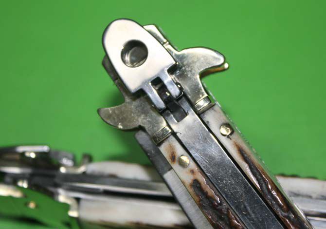 全 长 :24.5cm 柄 长 : 13.5cm 刃 长 : 10 cm 刃 厚 : 2.8mm 刃 材 : 高速D2钢 硬 度 : 58-60HRC 柄 材 : 双黄铜护手+鹿角 重 量 :140克 意大利AKC著名手工刀匠Bill Deshilvs设计,经典的杠杆纽扣锁定,弹簧快速打开刀刃,高速D2钢刀刃,搭配鹿角和铜护手,非常经典极具收藏价值,因为是出口尾货不打任何字唛,希望各位刀友们珍惜机会抢购,售完直至!9.5英寸,刀锋极其锋利!