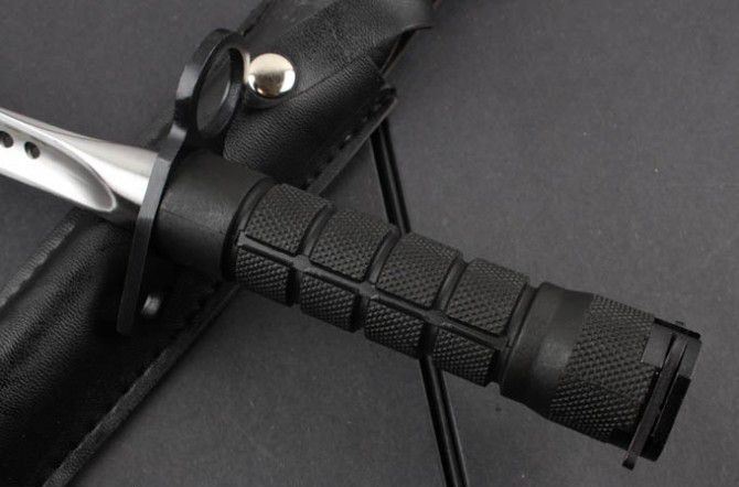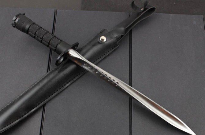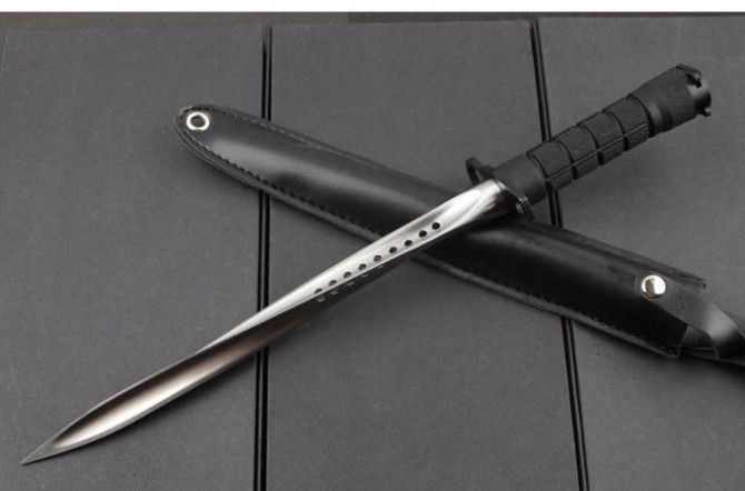 M9螺旋三棱军刺 长 度:41CM 刃 长:28CM 直 径:2.CM 重 量: 460g 硬 度: 56HRC 刀 材:3Cr13Mov 柄 材:ABS 其 他:防皮刀套 表面处理:砂光