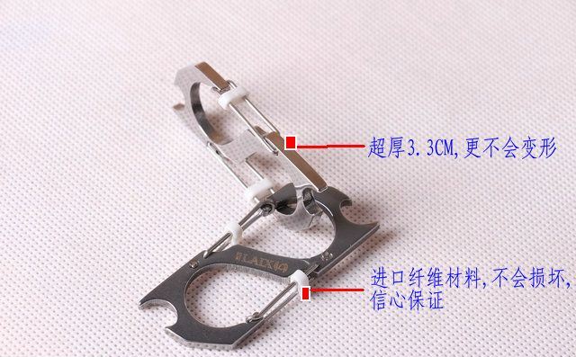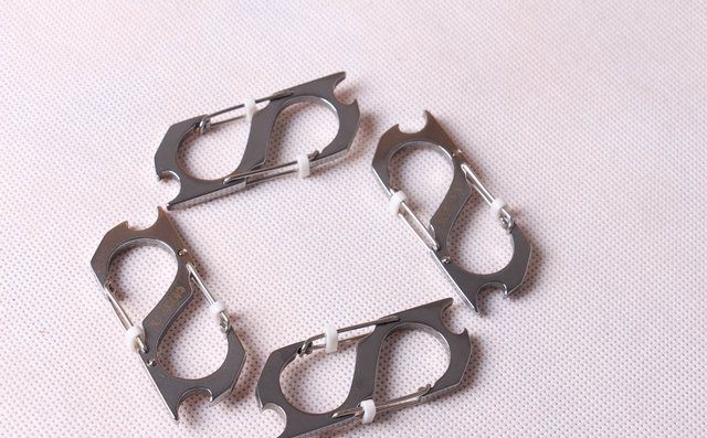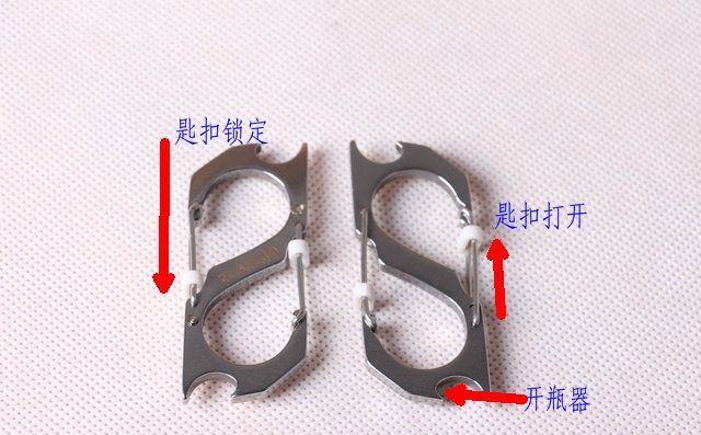 睐斯.万能钩(带开瓶) 材料:不锈钢 材料厚度:0.33cm 长:6.0cm 宽:2.5cm 用途:1.开瓶器 2.登山绳索挂钩 3.钥匙扣 4.适用于日常生活 备注:当有多个"S勾"时,可以连续相互挂在一起使用。