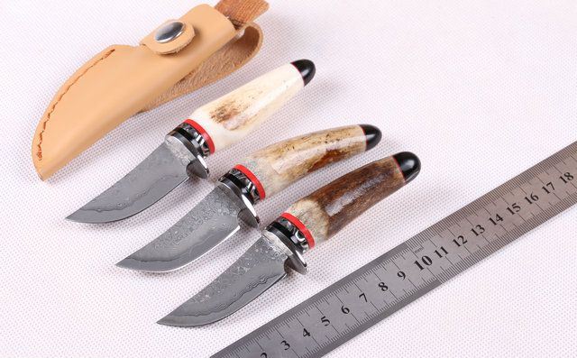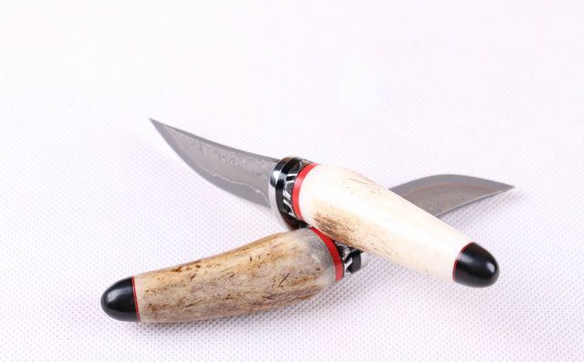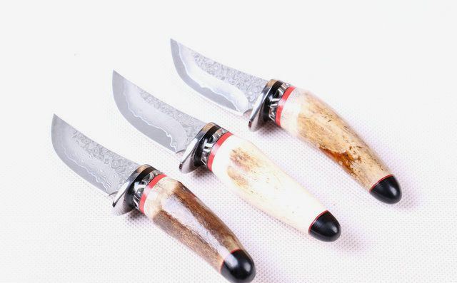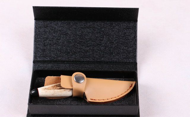 鹿角大马士小藏家 全 长: 约13.5cm 刃 长: 5.1cm 柄 长: 约7.8cm 刃 宽: 2.1cm(最宽处) 硬 度: 58HRC 刃 厚: 0.23cm 柄 材:野生鹿角 重 量:140 克(含包装) 刃 材: 大马士革 表 面: 特有的花纹原色 其 他: 配高档礼品盒.真皮套 大马士革钢花纹和把手木纹及颜色各异,以实物为准!
