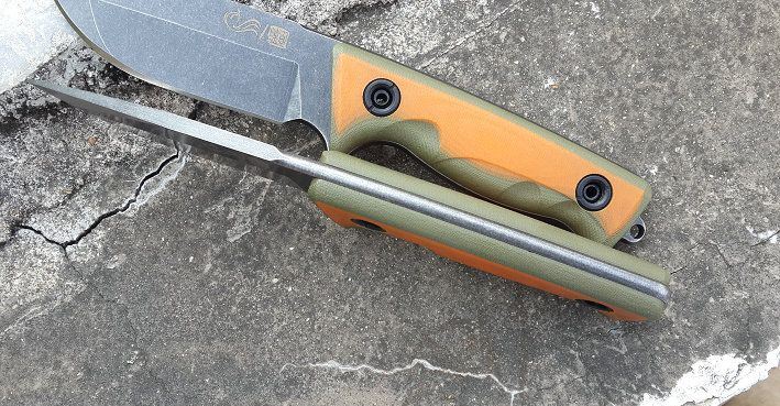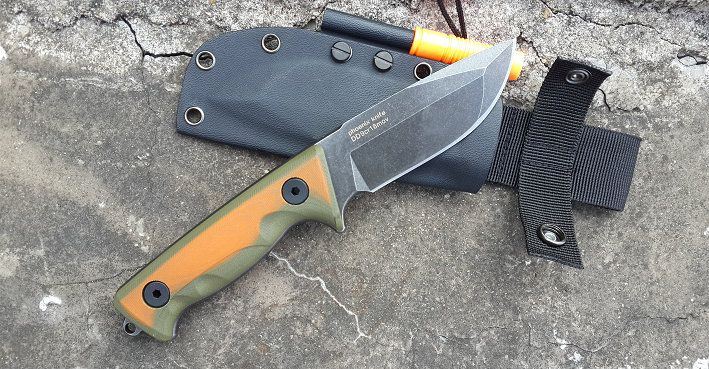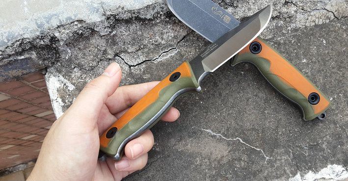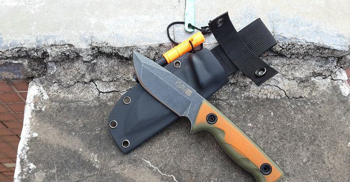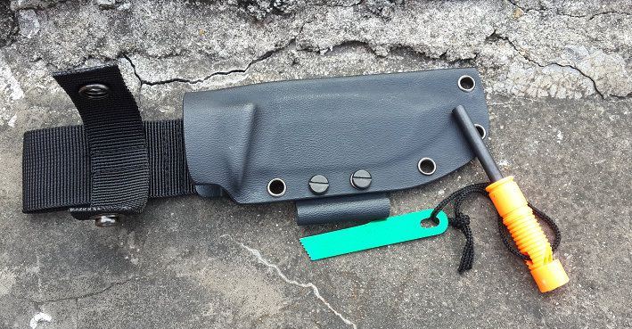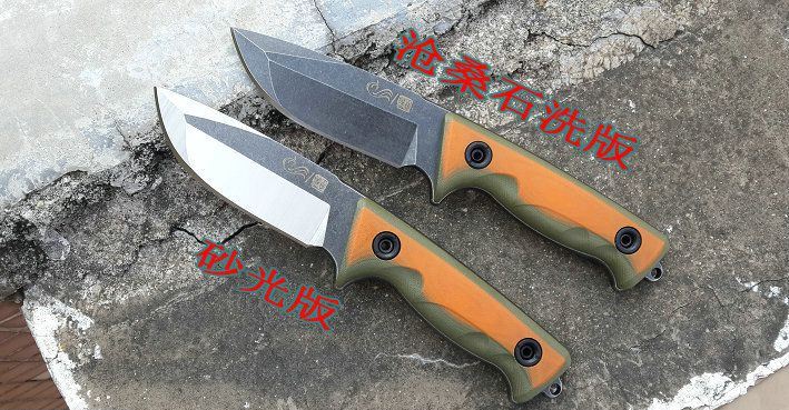 钢材:定制锻打9CR18mov 硬度:59-60 全长:220 刃长:9.8 柄长:12.2. 厚度:5.0 手柄橙绿:G10 带有打火棒(棒K鞘)