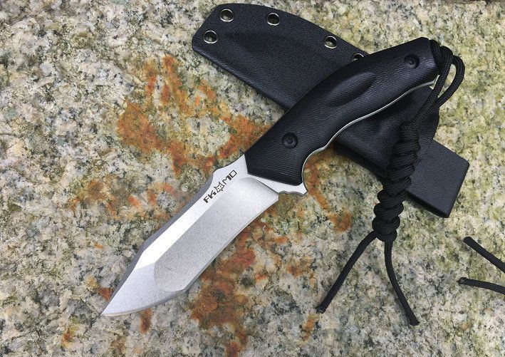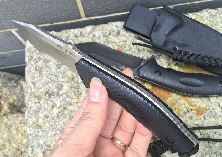 这把是意大利狐狸的战术小刀,除了极佳的美观性外,FOX刀具的战术刀具也深受刀友的好评。这把户外刀采用D2钢制造,并表面石洗处理,户外用时就不容易刮花,刀身硬度达到61HRC 。刀身上除了FOX的标志外,还留有刀具设计师Alfredo DORICCHI的姓名缩写,这把刀主要用于户外战术刀,尾部还设计了一个撞击针,它是一把多目的性、多功能性的刀。作为一把战术刀,剥动物皮的工作、切肉、水果、蔬菜、清理鱼、砍柴,砍树都能轻易完成。