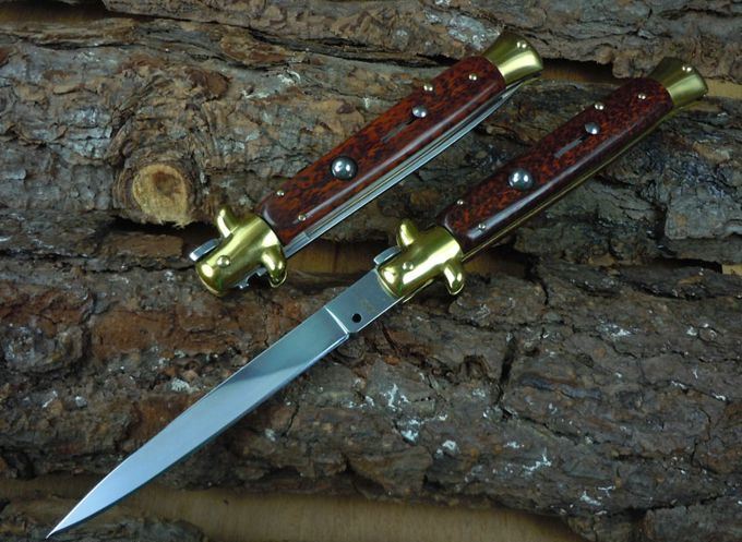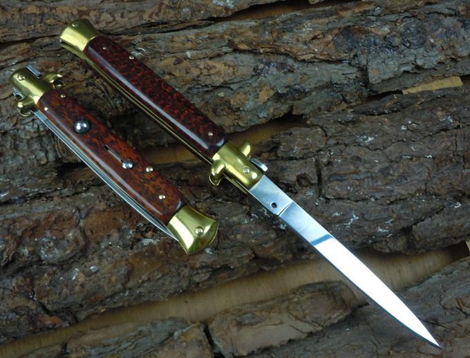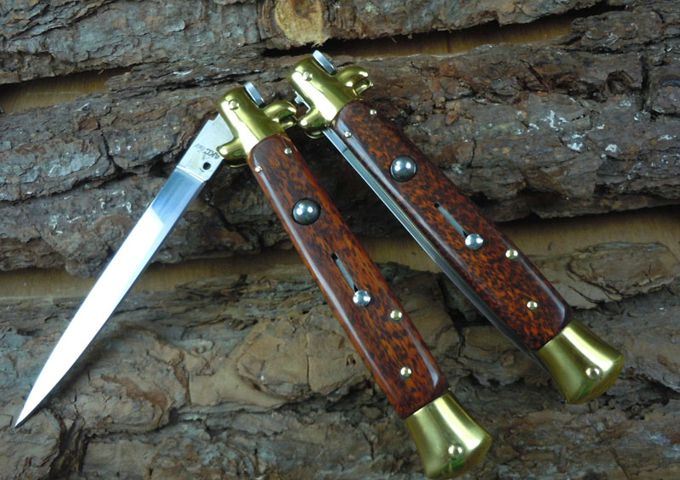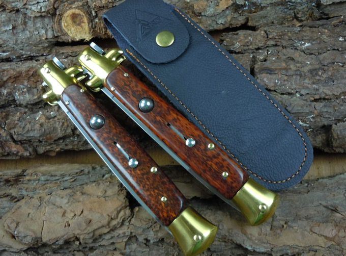 意大利黑手党使用的经典刀具-赌徒跳刀,在电影"教父"里出尽了风头!11英寸(28CM)天然蛇纹木柄(Moracea 蛇纹木,属产地:分散在南美洲亚马逊河流域附近的原始丛林中。小树冠乔木,无板根,高25m,主干15m,直径30—50bm,该树种为世界珍惜濒危保护植物,是世界上最名贵的木材之一)的黑手党侧跳,出刀迅速,锁定稳固,具有超强的穿刺力!带有保险装置,刀护手处暗藏闭合开关,配备牛皮软套,AKC公司出口产品,性能优越,满足把玩和收藏的需要