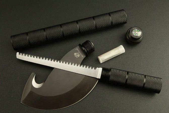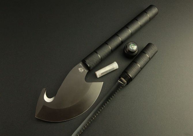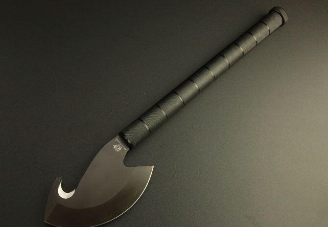 全 长: 51cm 刃 长: 16.5cm 柄 长: 36cm 刃 材: 440 不锈钢 硬 度: 56 HRC 表 面: 氧化黑 刃 厚: 4.5cm 净 重: 710g(含包装) 其 他:全刃开锋,附尼龙套