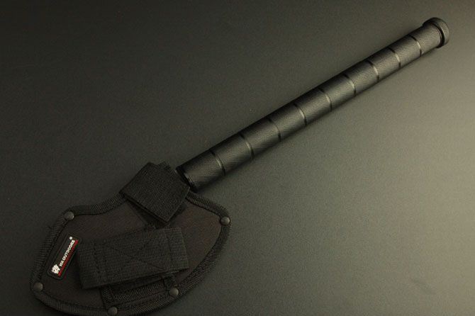熊出没—工兵斧 全 长: 51cm 刃 长: 16.5cm 柄 长: 36cm 刃 材: 440 不锈钢 硬 度: 56 HRC 表 面: 氧化黑 刃 厚: 4.5cm 净 重: 710g(含包装) 其 他:全刃开锋,附尼龙套