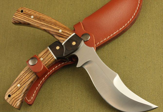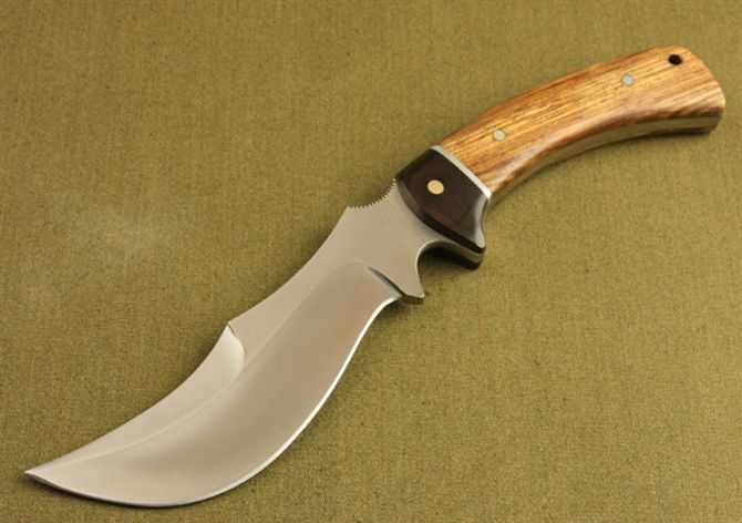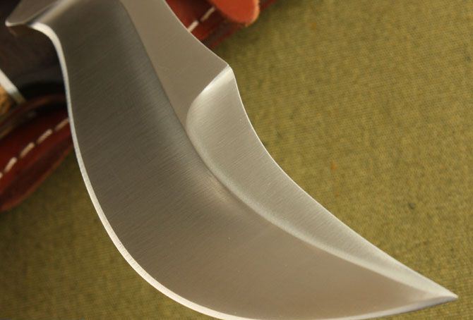 小水牛猎刀 全 长:282mm 刃 长:150mm 刃 宽:40mm 刃 厚:5mm 刀重:296g 刃 材:AUS-8A 硬 度:58HRC(真空热处理) 表 面:钢本色 柄 材:斑马木 刀 鞘:牛皮套