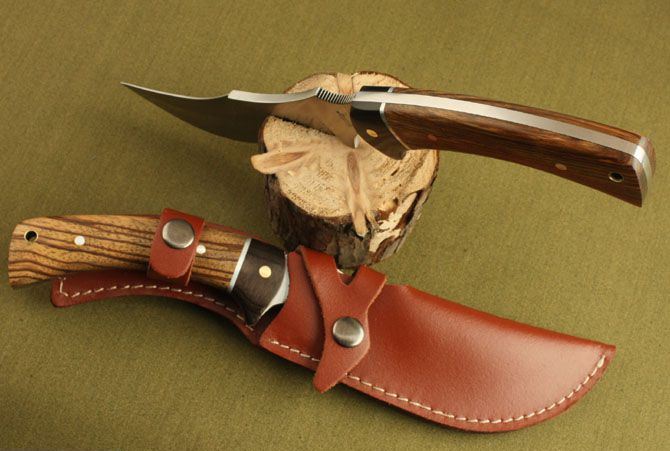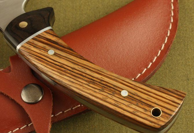 全 长:282mm 刃 长:150mm 刃 宽:40mm 刃 厚:5mm 刀重:296g 刃 材:AUS-8A 硬 度:58HRC(真空热处理) 表 面:钢本色 柄 材:斑马木 刀 鞘:牛皮套