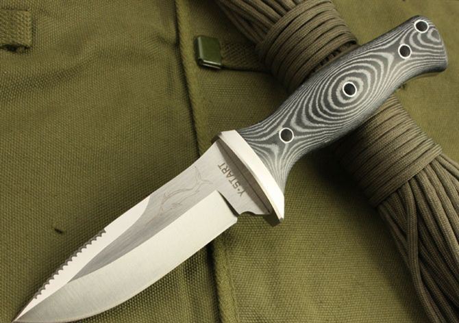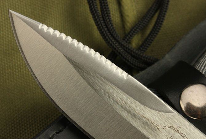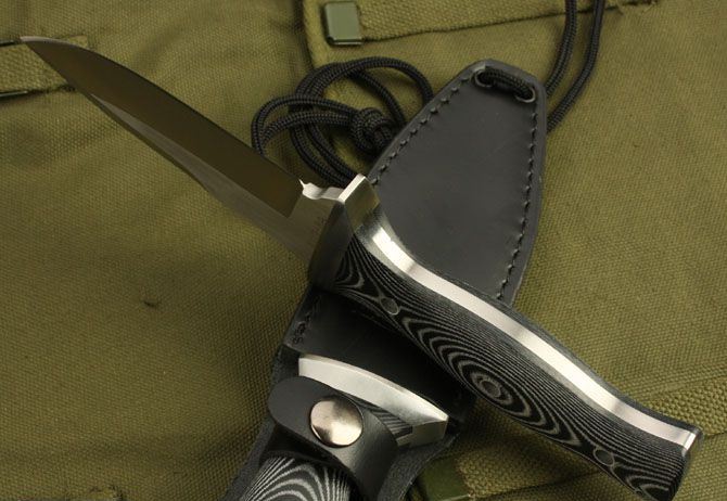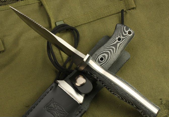布兰登-剑鱼小直(背齿) 全长:227mm 刃长:111mm 刃宽:29mm 刃厚:4.8mm 刀重:220g 毛重:300g 刃材:AUS-8A 硬度:58HRC{真空热处理) 表面:钢本色 柄材:米克塔 刀鞘:手工缝制,黑色头层牛皮