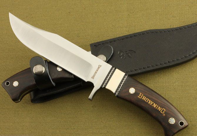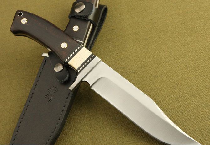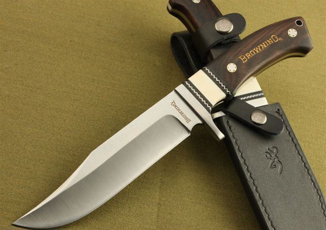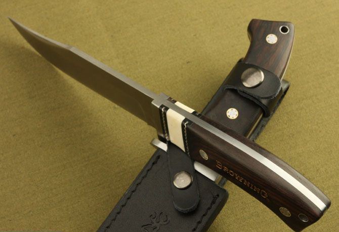 勃朗宁—大护法直刀 全长:28cm 刃长:15.5cm 柄长:12.5cm 刃厚:4.1mm 重量:475g(含包装) 刃材:7Cr17 硬度:58HRC 表面处理:砂光 柄材:骨片+黑檀木