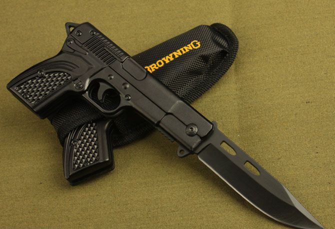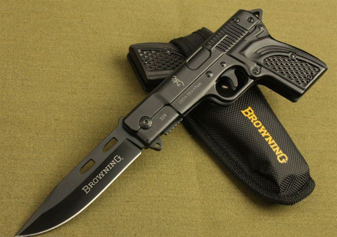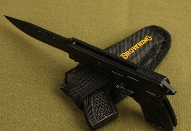 勃朗宁-枪型折刀 全 长:22cm 刃 长:9.5cm 柄 长:13cm 刃 厚:3.2mm 刃 材:3Cr13 柄 材:铝柄 硬 度:55HRC 表 面:氧化黑 重 量:210g 锁 定: 快开