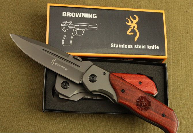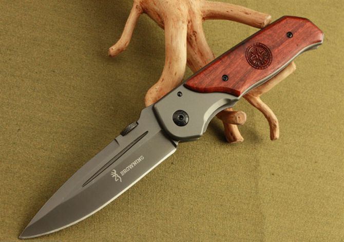 勃朗宁—DA30折刀 全长:22.5cm 刃长:10cm 柄长:12cm 刃厚:3.6mm 刃材: 3Cr13 柄材: 红酸枝 硬度: 55HRC 重量:200克 表面处理:灰钛 锁型:快开