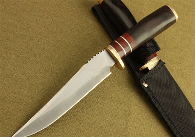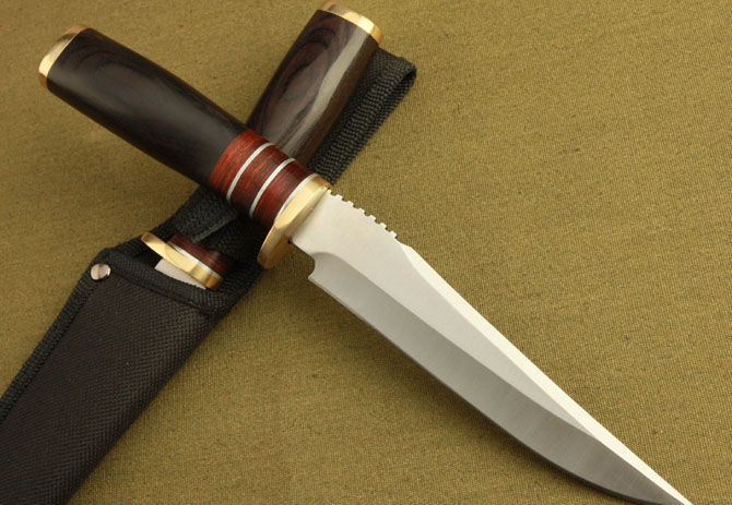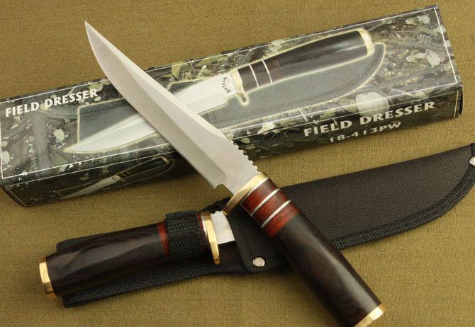 勃朗宁18-413PW直刀 全长:25.7cm 刃长:15cm 柄长:10.7cm 刃厚:3.4mm 重量:300g(含包装) 刃材:5Cr13 硬度:56HRC 表面处理:砂光 柄材:铜头+彩木