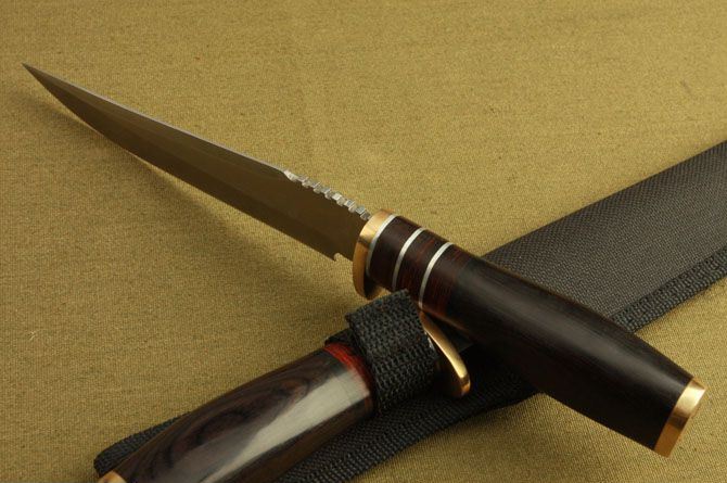 全长:25.7cm 刃长:15cm 柄长:10.7cm 刃厚:3.4mm 重量:300g(含包装) 刃材:5Cr13 硬度:56HRC 表面处理:砂光 柄材:铜头+彩木