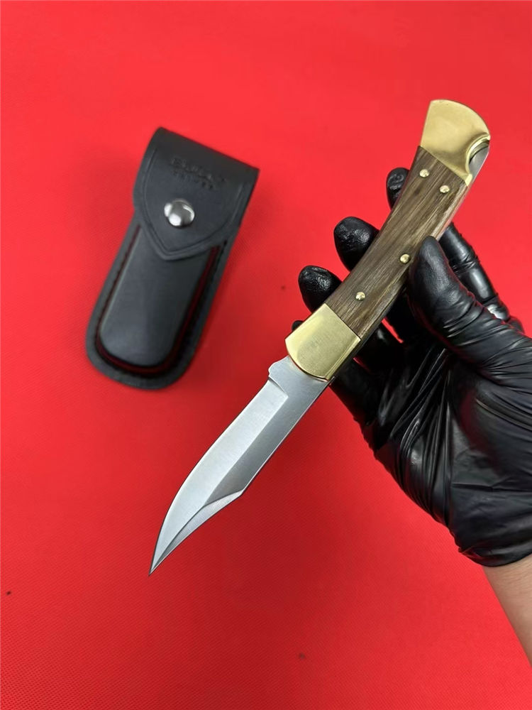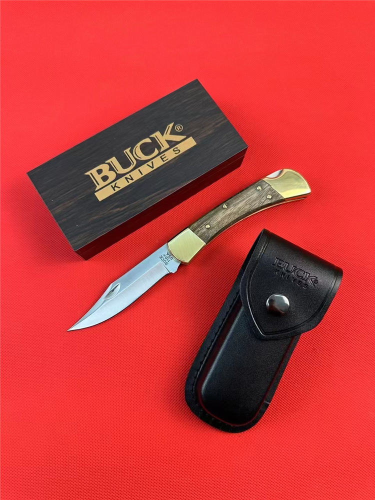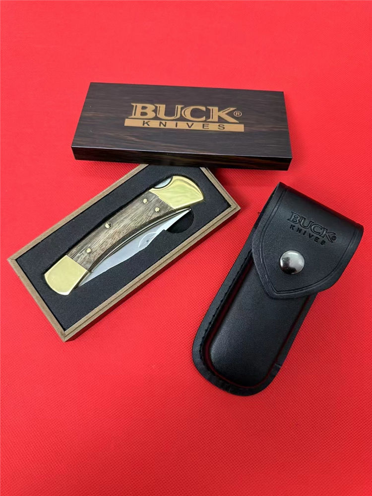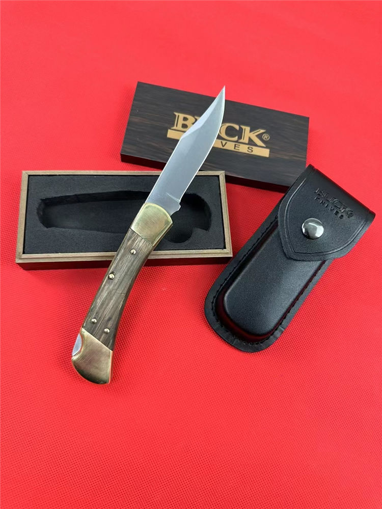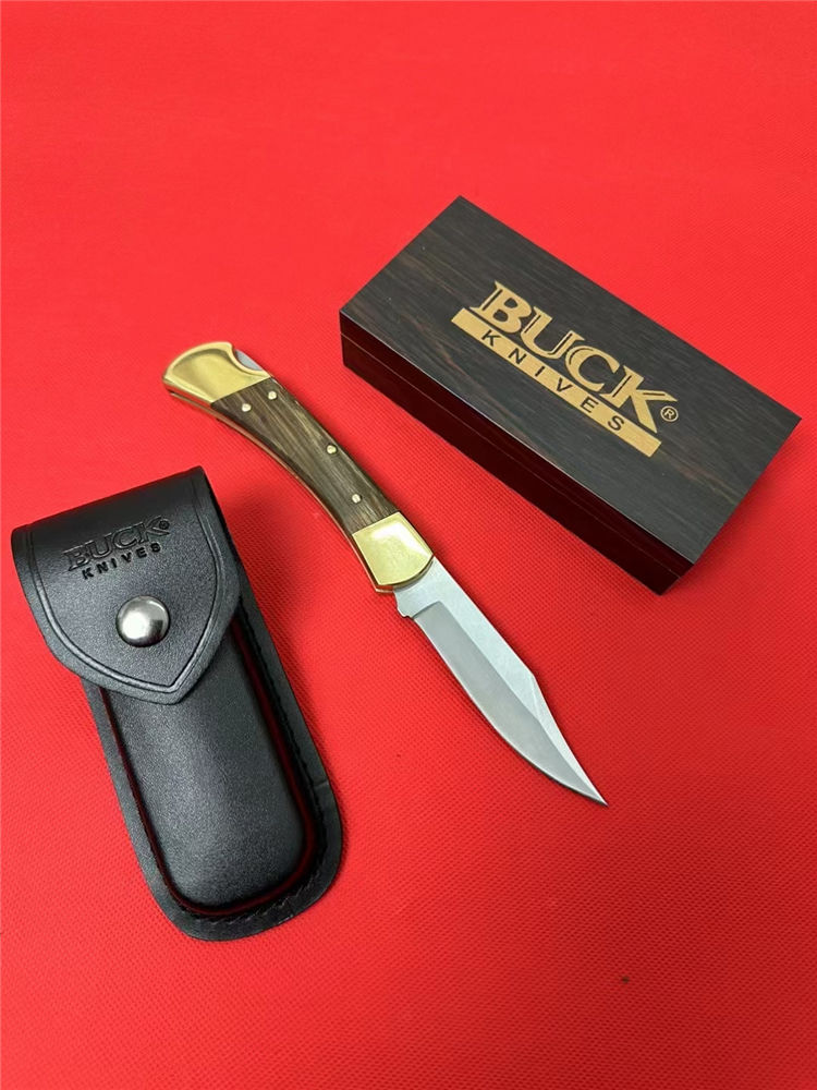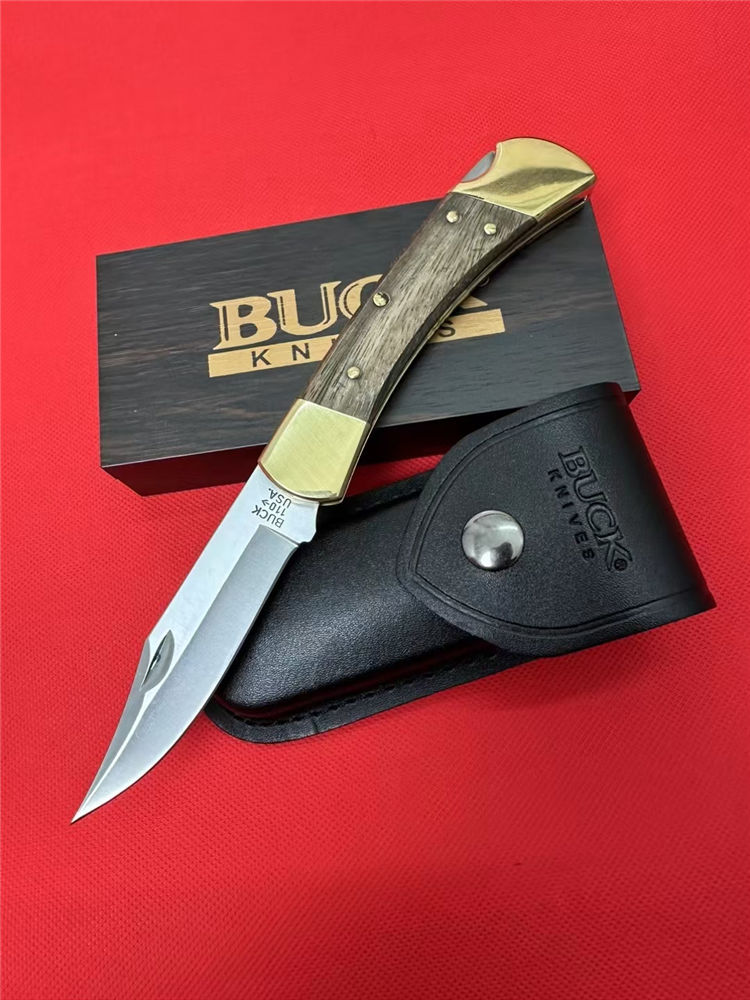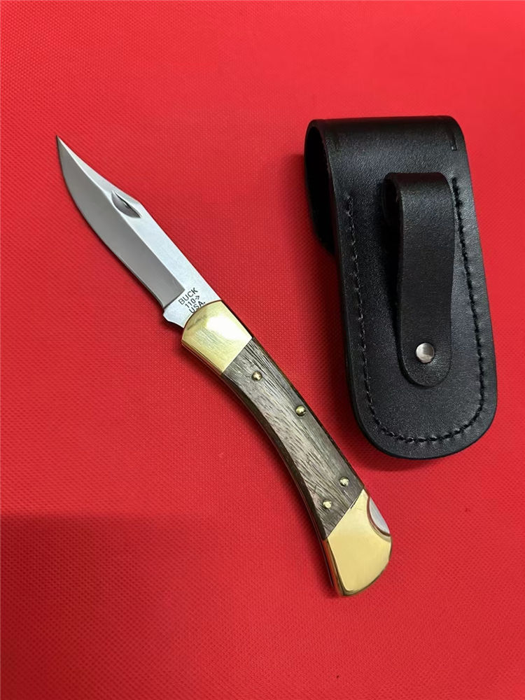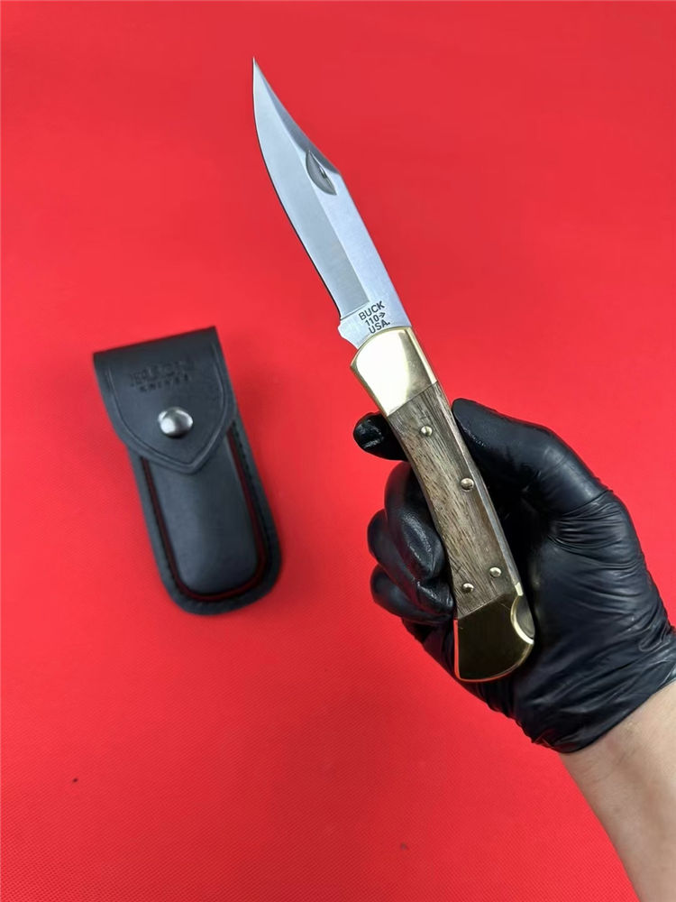 巴克110双铜头折刀 全长:22 刃长:9.5 刃材料:进口440C(美产) 刃厚:0.3宽刃口特锋利 硬度:59-60(实测硬度) 手柄:一体黄铜+实木(铜铆钉凸出,有效防滑)