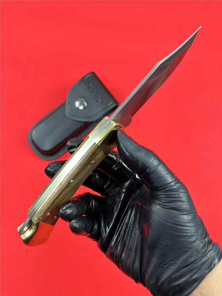 全长:22 刃长:9.5 刃材料:进口440C(美产) 刃厚:0.3宽刃口特锋利 硬度:59-60(实测硬度) 手柄:一体黄铜+实木(铜铆钉凸出,有效防滑)