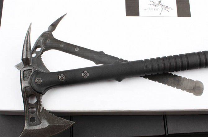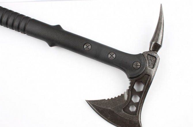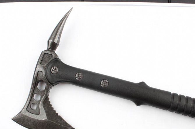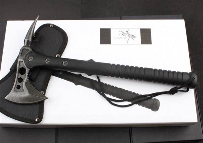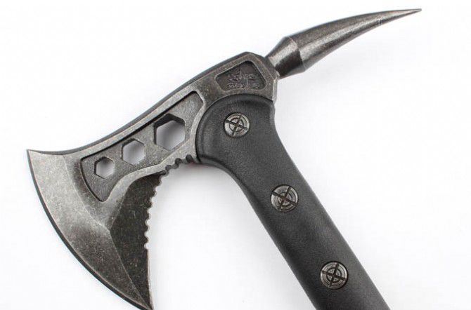 螳螂—凿子两用斧 全 长:385mm 刃 长:95mm 柄 长:145mm 刃 宽:162mm 刃 厚:22mm 刃 材:3Cr13Mov 重 量:720g(含包装) 硬 度:56HRC 表 面:石洗 柄 材:尼龙波纤 锁 型:定锁 其 他:配尼龙套