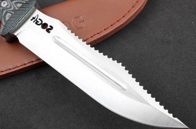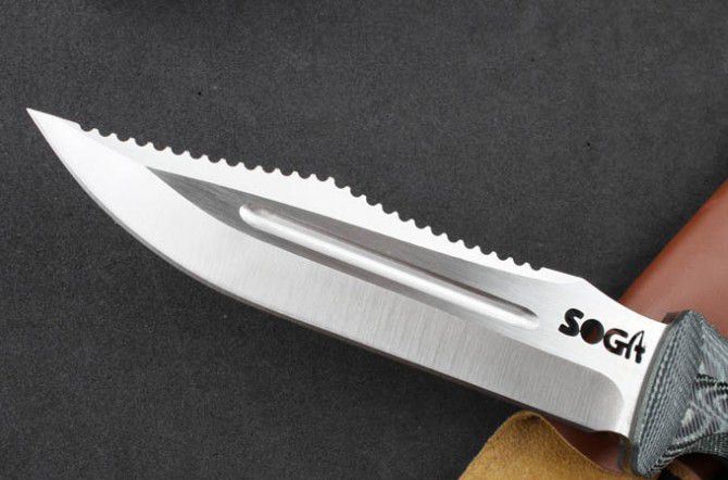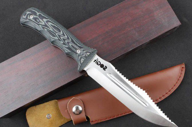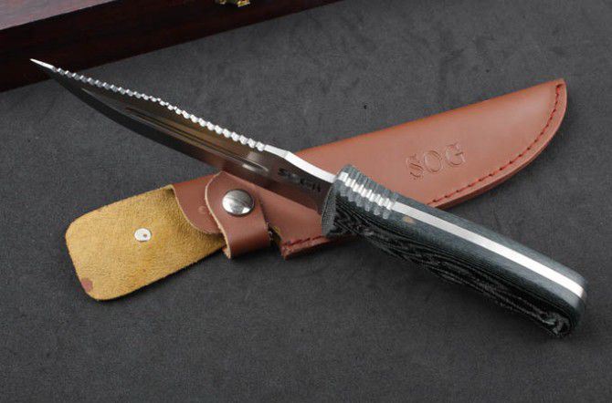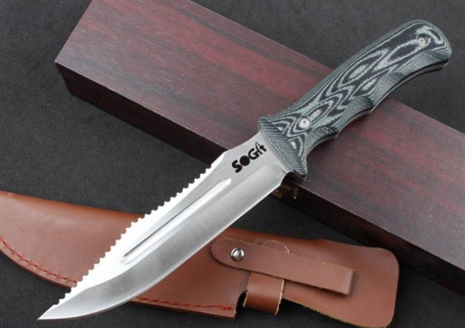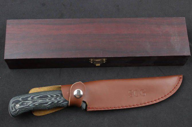 YK01烈火战士(SOG) 全 长:28.3mm 刃 长:15.8mm 柄 长:12.5mm 刃 宽:33mm 刃 厚:5mm 刃 材:5Cr13Mov 重 量:573g(含包装) 硬 度:57HRC 表 面:拉丝 柄 材:G10 锁 型:定锁 其 他:配牛皮套和木盒