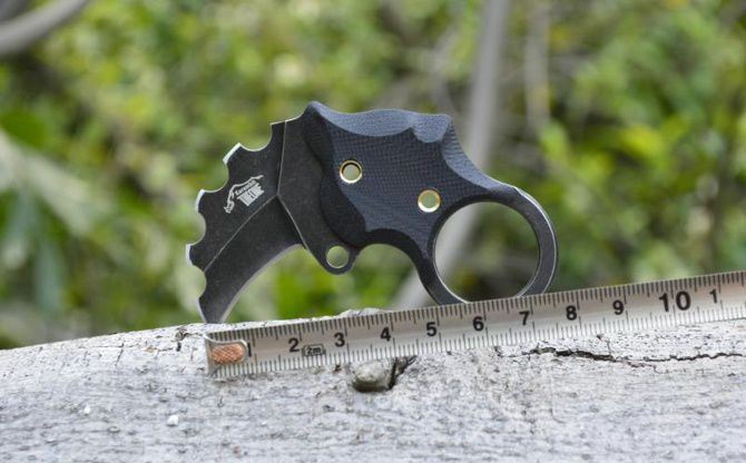 刃 长:3CM 刃 厚:0.4CM 刃 材:AUS-8(真空热处理) 硬 度:59-60 表 面:沧桑石洗 柄 材:G10防滑纹,空心铜铆 刀 鞘:Kydex(k 鞘)