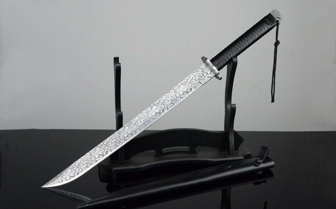 全长:72cm(不含皮鞘) 刃长:49.3cm 柄长:22.5cm 刃宽: 4cm 刃厚:0.61cm 净重:1200g(刀重) 全重:1720g(含皮鞘,尼龙拉链背袋) 刃材:7Cr17 表面:菊纹 装材:钢 鞘材:真皮 柄材:绑皮 包装:皮鞘、尼龙拉链背袋(携带起来很方便!) 硬度区间:58HRC