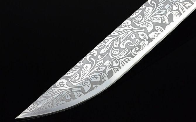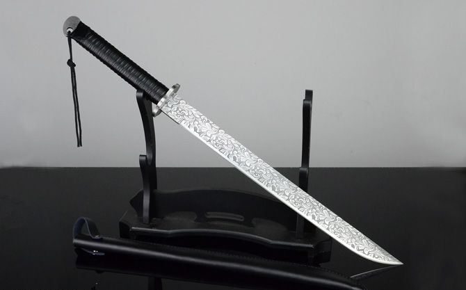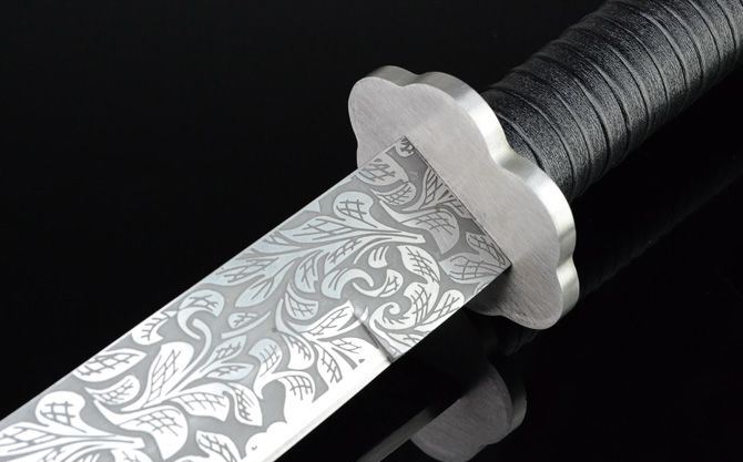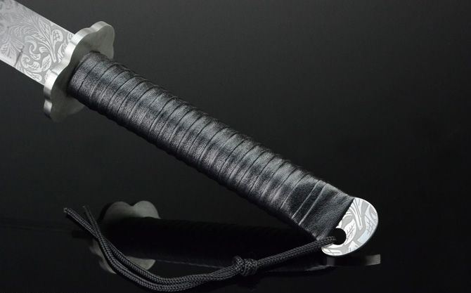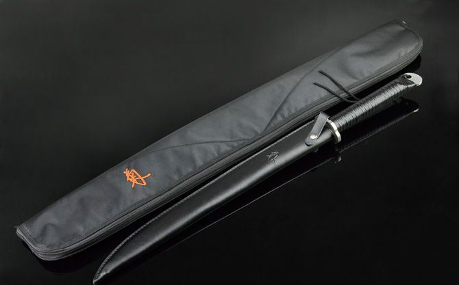 菊侠.武士刀 全长:72cm(不含皮鞘) 刃长:49.3cm 柄长:22.5cm 刃宽: 4cm 刃厚:0.61cm 净重:1200g(刀重) 全重:1720g(含皮鞘,尼龙拉链背袋) 刃材:7Cr17 表面:菊纹 装材:钢 鞘材:真皮 柄材:绑皮 包装:皮鞘、尼龙拉链背袋(携带起来很方便!) 硬度区间:58HRC