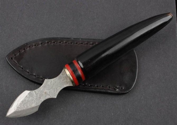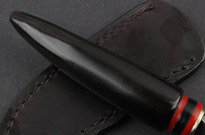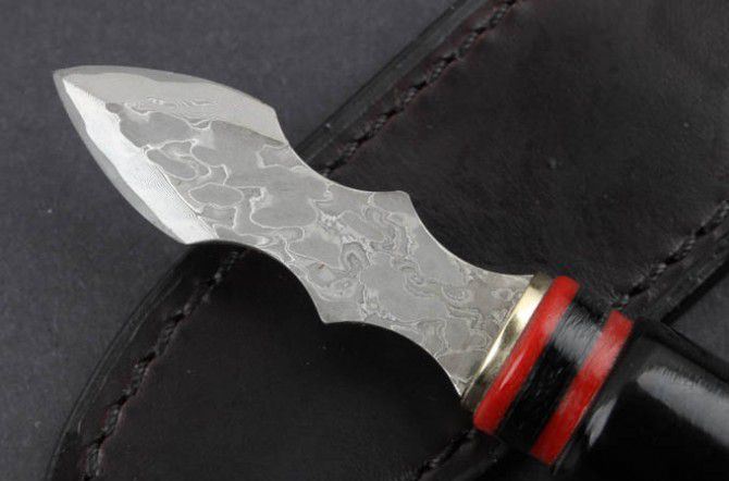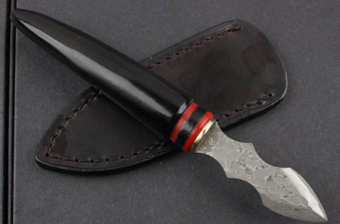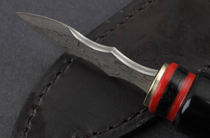 水牛角樱枪大马士革刀 全 长:152mm 刃 长:55mm 柄 长:97mm 刃 宽:17mm 刃 厚:2.1mm 刃 材:大马士革 重 量:127g(含包装) 硬 度:58HRC 表 面:钢本色 柄 材:铜头+水牛角 锁 型:定锁 其 他:配牛皮套+硬纸盒