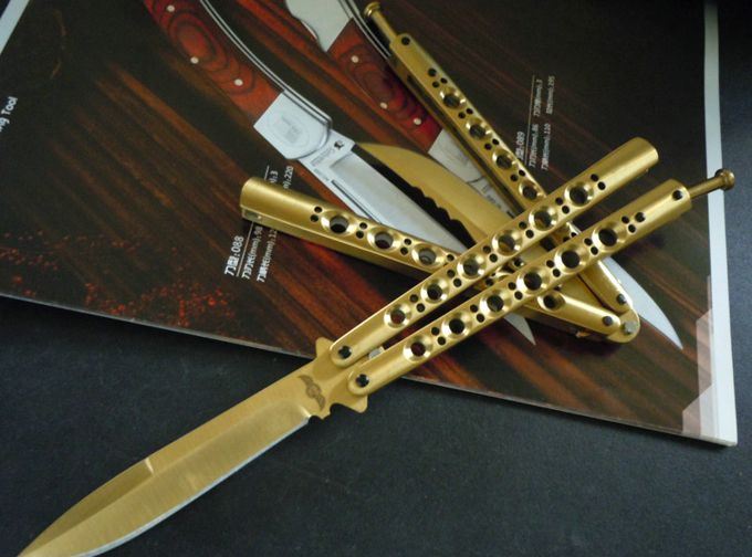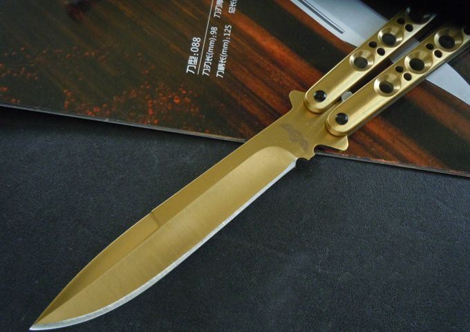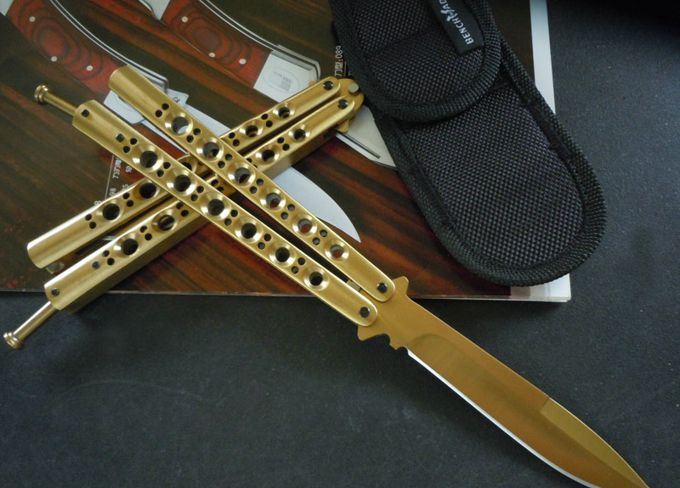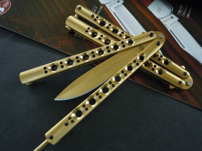 全长:23.8CM 刃长:9.5CM 刃厚:0.3CM 刃材料:440C 刃硬度:58 柄材料:不锈钢压铸,表面钛金 柄硬度:40 重量:150克 刀鞘:刺绣高级尼龙套,可横竖挂皮带 THE ONE 金装版BM42,最经典Benchmade(蝴蝶)甩刀,由The one (唯一)精工打造,整刀用铆钉铆合,省去螺丝难维护的特点,一体柄型更坚固和耐摔,转动灵活,由THE ONE 出品,不可多得的精品甩刀