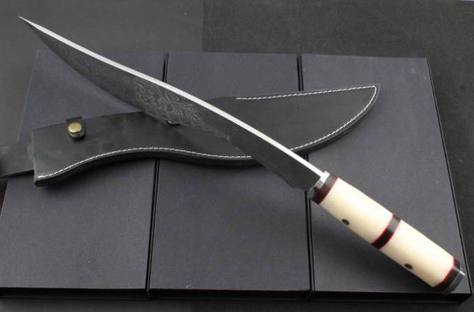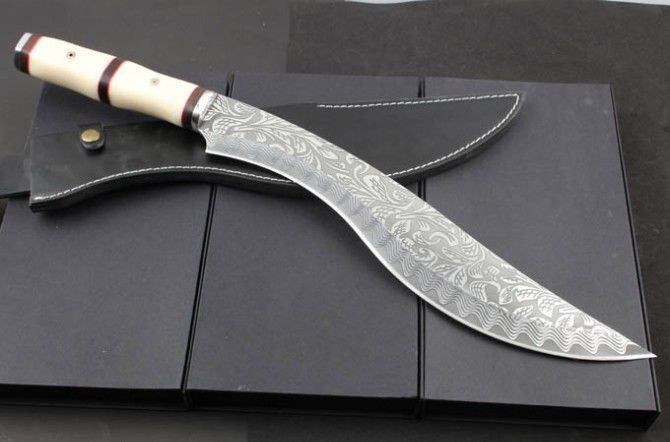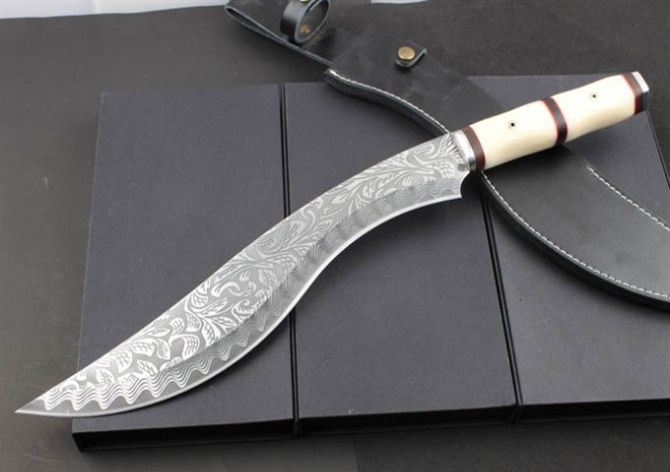 花纹月牙扎花弯刀 全 长: 55.6cm 刃 长: 38.8cm 刃 厚: 5.2mm 刃 宽: 6.6cm(最宽处) 刃 材: 420 硬 度: 57HRC 刀 重: 1322克(含包装) 表 面: 超镜光 柄 材: 钢+黑檀木+仿骨 结 构: 一体龙骨 刀 鞘: 牛皮套 +纸盒