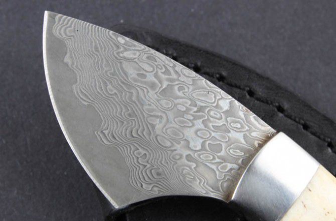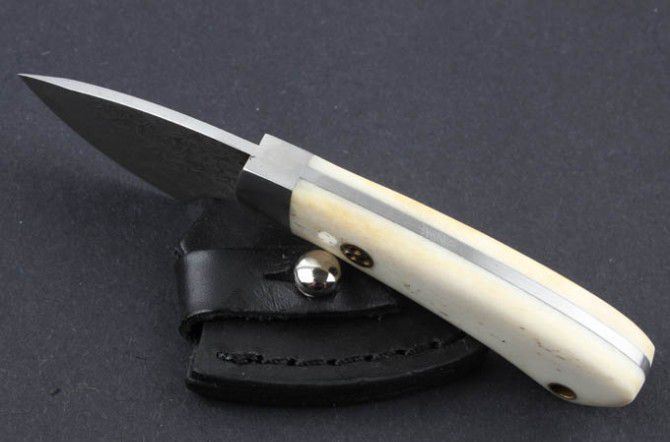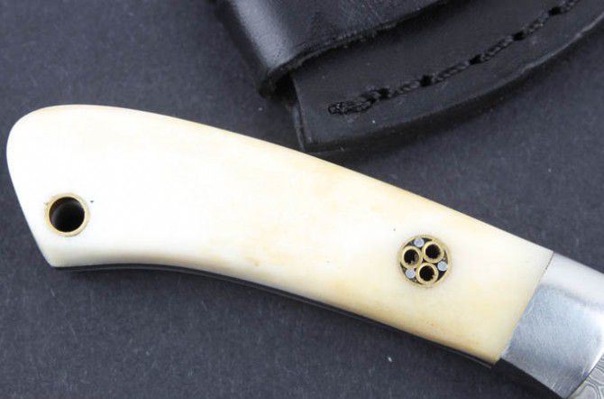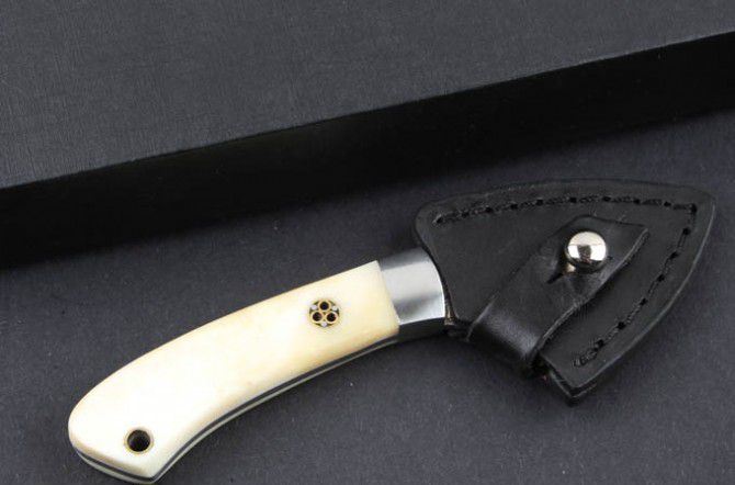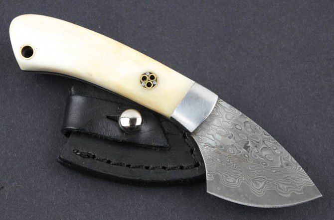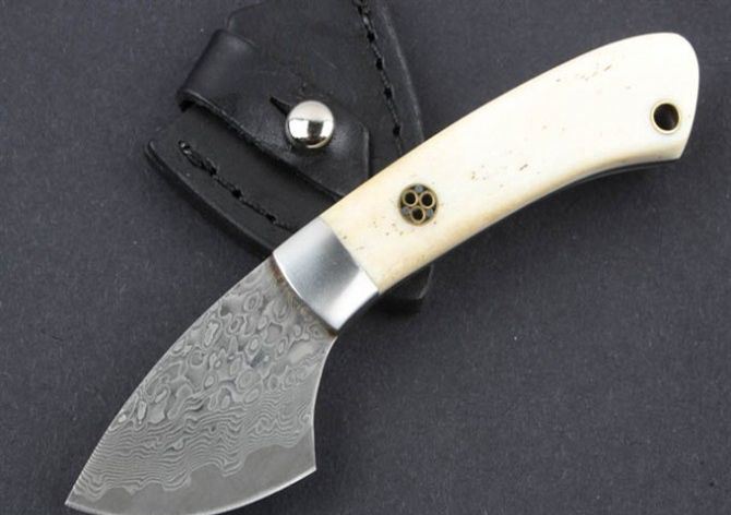 牛骨白柄大马士革刀 全 长:11.5cm 刃 长:4.4cm 柄 长:7.3cm 刃 宽:3.8cm(最宽处) 硬 度:59HRC 刃 厚:0.22cm 毛 量:160克(含皮套) 表 面:纯手工制造 柄 材:牛骨柄+金属 其 他:刃口锋利 大马士革钢花纹和把手柄及颜色各异,以实物为准