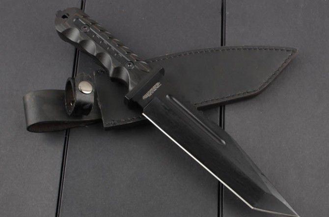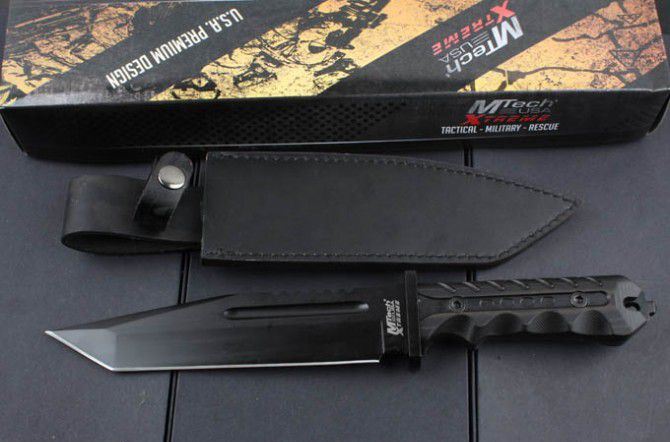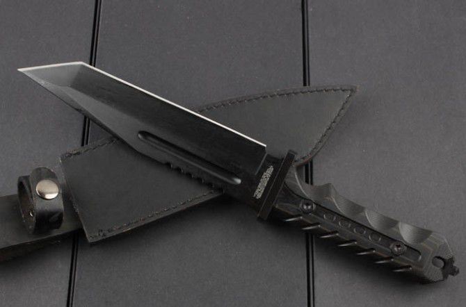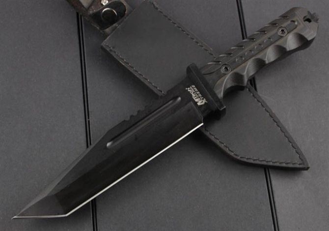 TY-01直刀 全 长:340mm 刃 长:187mm 柄 长:136mm 刃 宽:40mm 刃 厚:6.0mm 刃 材:5Cr13Mov 重 量:675g(含包装) 硬 度:57HRC 表 面:氧化黑 柄 材:G10 锁 型:定锁 其 他:配牛皮套和彩盒