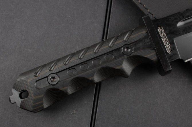 全 长:340mm 刃 长:187mm 柄 长:136mm 刃 宽:40mm 刃 厚:6.0mm 刃 材:5Cr13Mov 重 量:675g(含包装) 硬 度:57HRC 表 面:氧化黑 柄 材:G10 锁 型:定锁 其 他:配牛皮套和彩盒