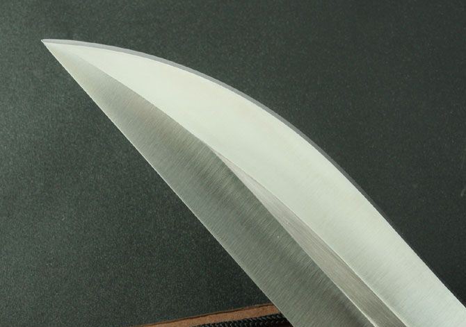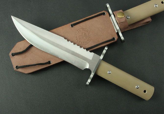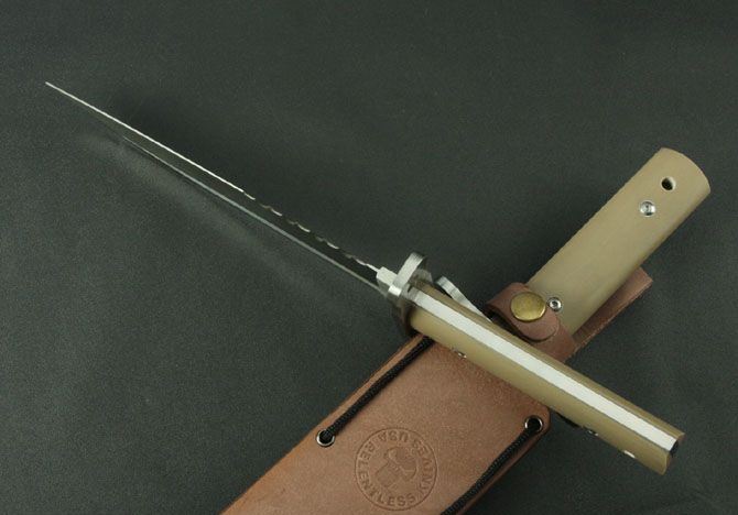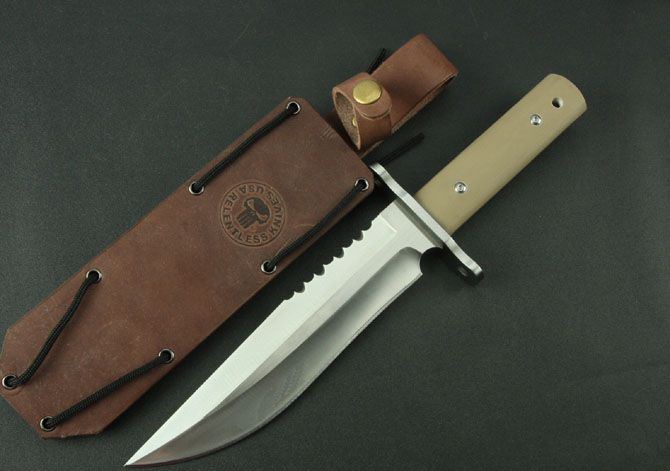 无情者系列.响尾蛇军用求生刀 全 长:325mm 刃 长:185mm 柄 长:120mm 刃 宽:42mm 刃 厚:5.5mm 刃 材:7Cr17Wov 重 量:600g(含包装) 硬 度:58HRC 表 面:砂光 柄 材:沙漠色G10 锁 型:定锁 其 他:配皮套