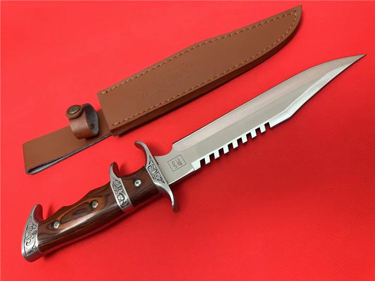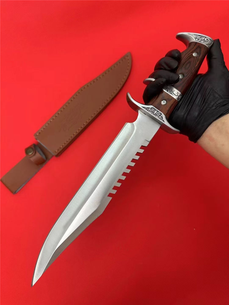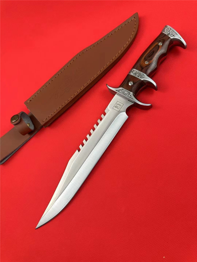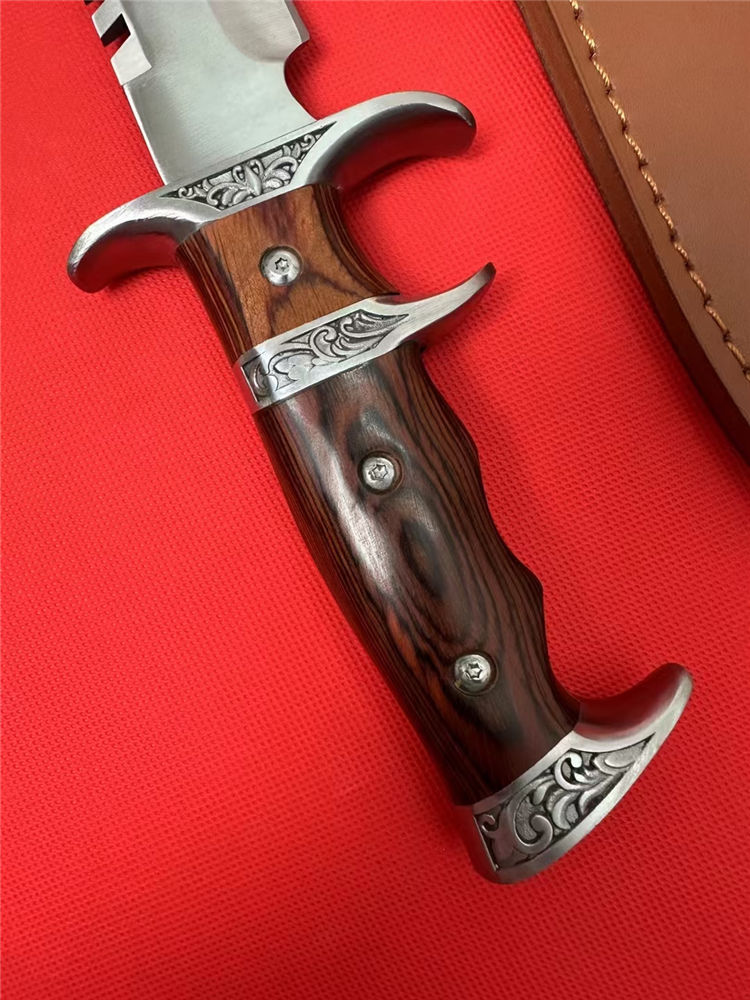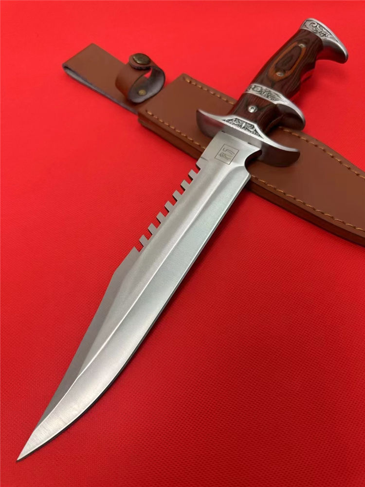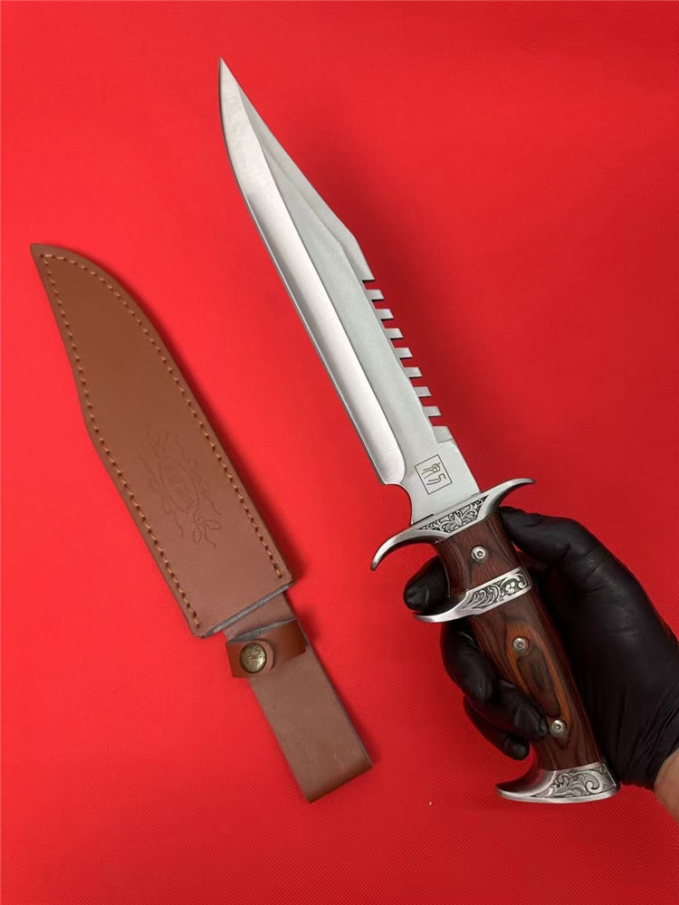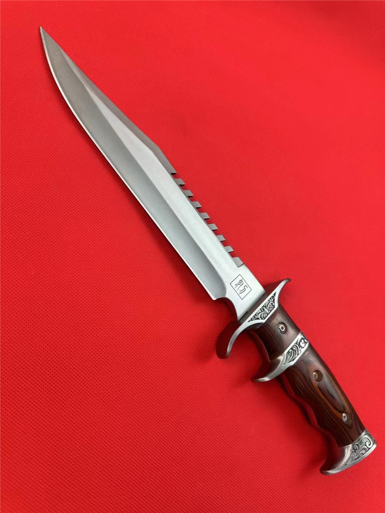 刀奴系列战斗刀 (小号) 全长:38cm 刃长:24cm 刃厚:0.80 刃材: 440高级不锈钢 硬度: 57HRC 表面:镜光 重量:1454g(含包装) 刀柄:钢头+红木 刀鞘:牛皮+纸盒