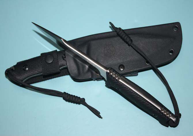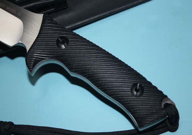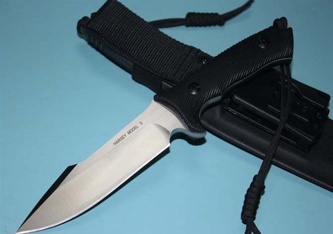 全 长:26.7cm 刃 长:13cm 柄 长:12cm 刃 厚:0.6cm 表 面:砂光、缎面拉丝 净 重:350克 毛 重:500克 硬 度:59-60hrc (真空油淬热处理) 手 柄:黑色G10 刀 鞘:进口Kydex鞘