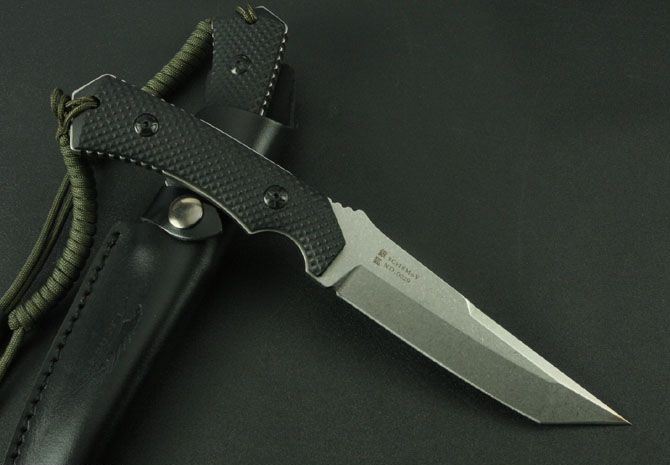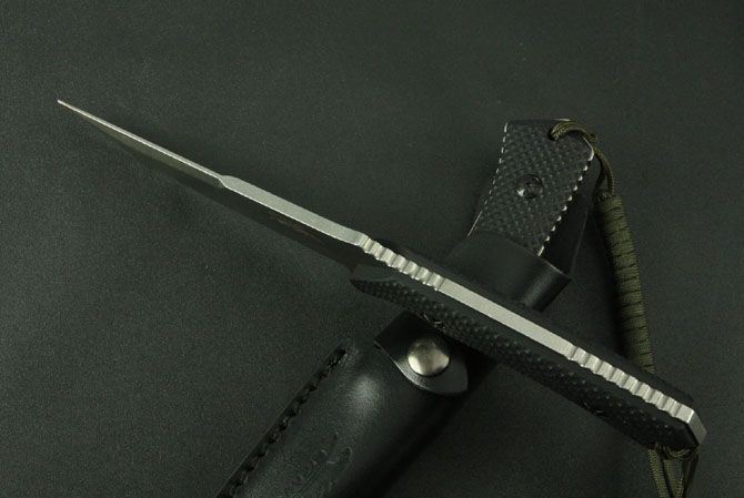总长:260mm 刃长:120mm 刃宽:30mm 柄长:120mm 刃厚:5mm 硬度:58HRC-59HRC 刃材:9CR18MOV钢 手柄材料:黑色G10(CNC电脑锣精密加工成型,精细手工打磨处理) 包装材料:纯手工缝制头层牛皮套 刀具切割:龙骨一体数控线切割 热处理:采用真空热处理,再经过零下80度的深冷处理 表面处理:纯手工表面石铣 平面处理:纯手工开刃数控V磨 其他工艺:正面激光二马LOGO,反面激有唯一编号