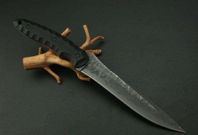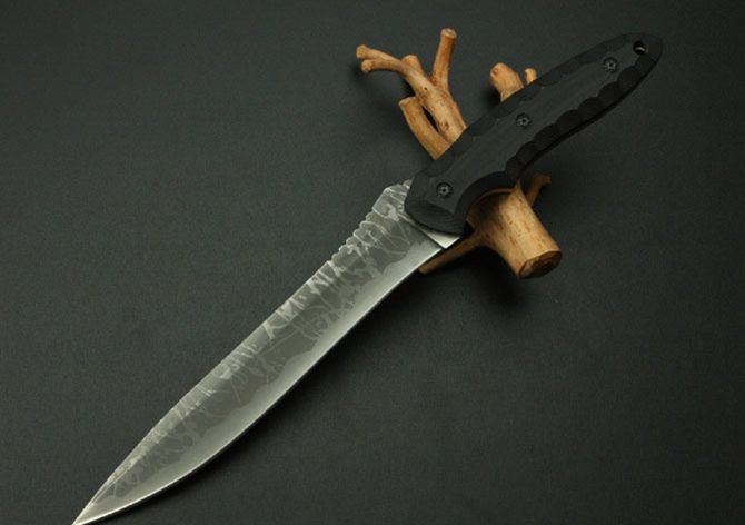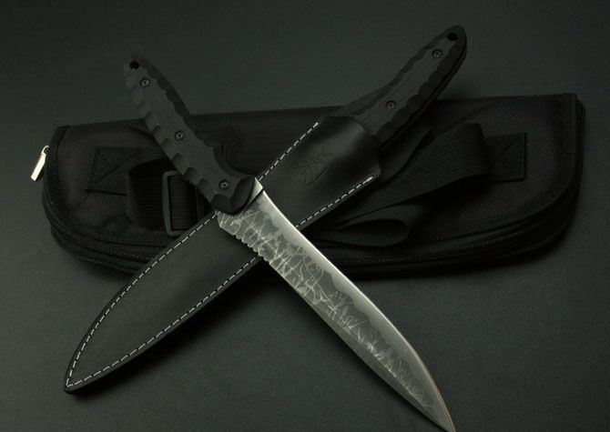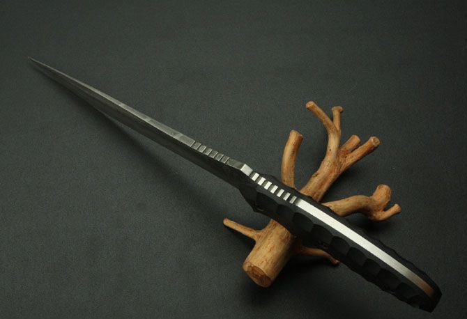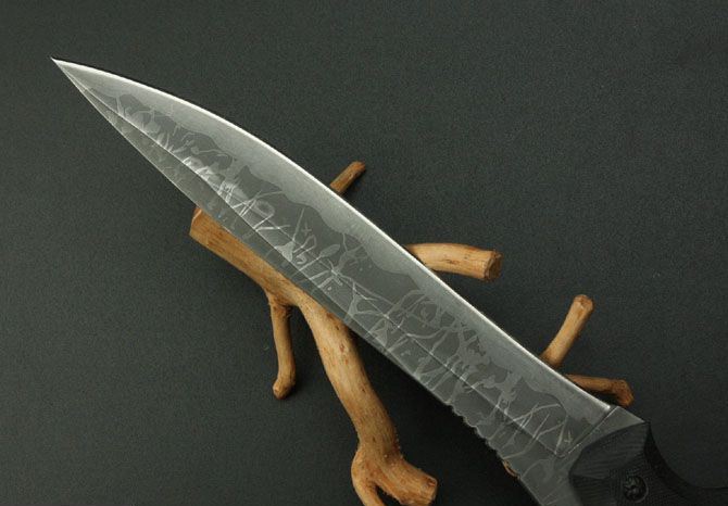 菊男--古法浪刃 全长:35.5CM 刃长:21CM 刃材:7Cr17 硬度: 60HRC 刃厚: 0.56CM 刃宽:3.1CM (最宽处) 柄长: 14.5CM 柄材: G10 重量:520g 刀鞘:尼龙套